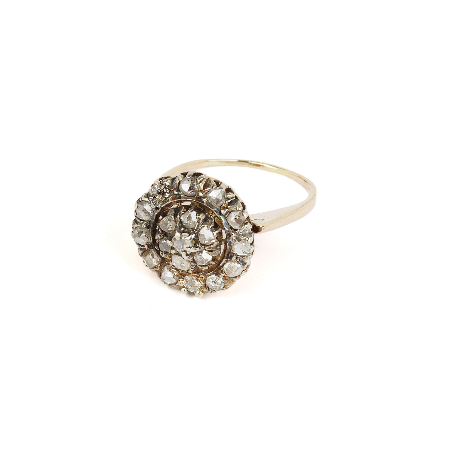 Antique 14k yellow gold ring with rose cut diamonds which amount to approximately 0.50 carat TW (I1 clarity/light brown color). Fits a size 7.5 finger, measures 16mm wide across the top, and weighs 5.3 grams.