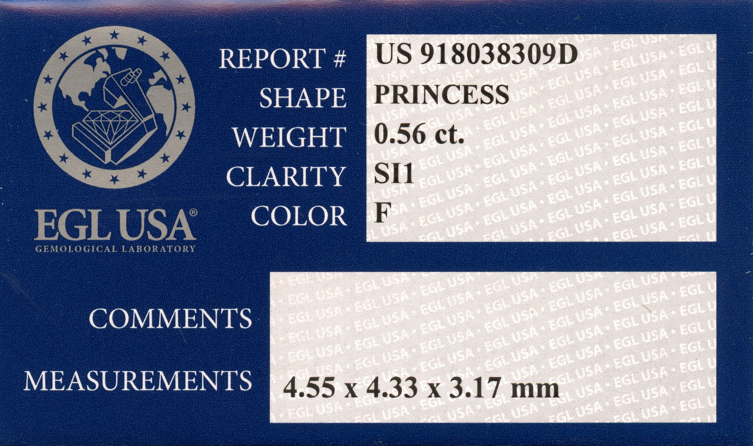Loose EGL Certified 0.56ct Princess Cut Diamond F/SI1. EGL cert # 918038309D is included in the sale.