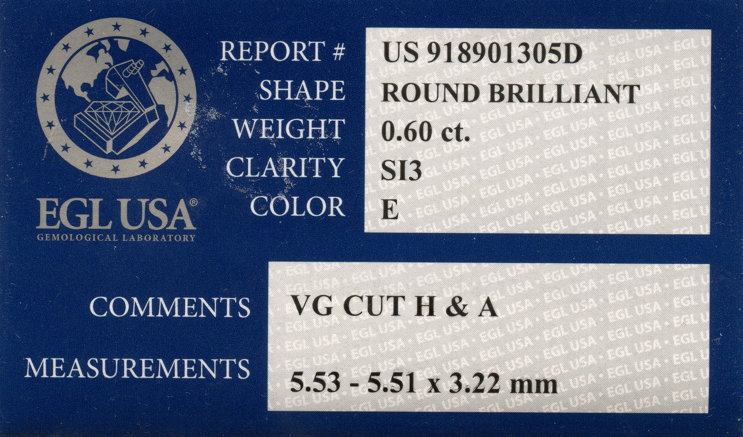 Loose EGL Certified 0.60ct Round Brilliant Cut Diamond E/SI3. EGL cert # 918901305D is included in the sale.