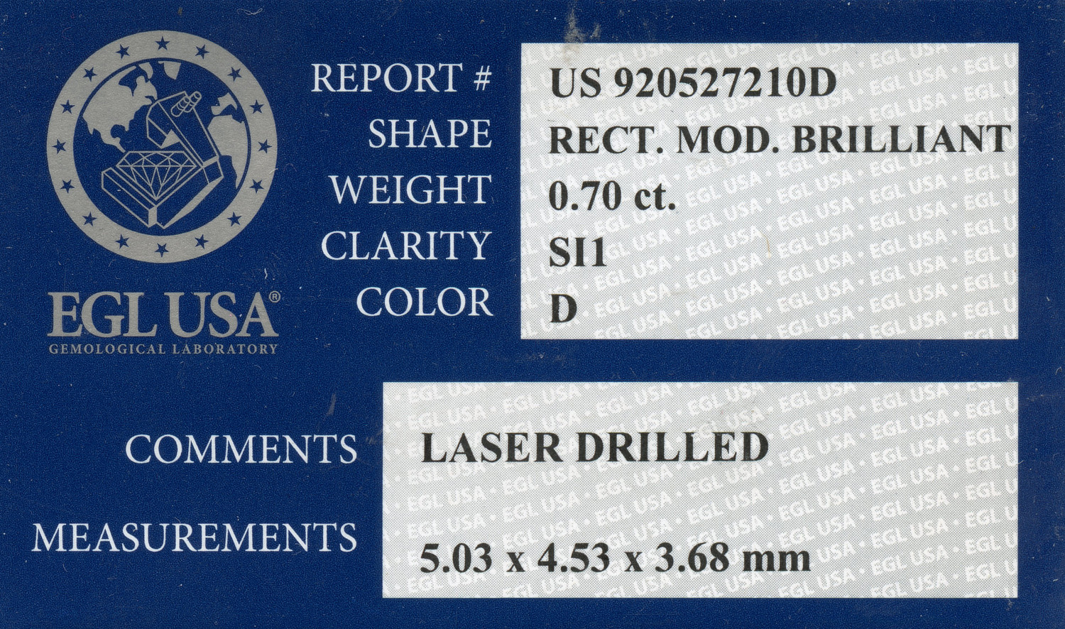 Loose EGL Certified 0.70ct Radiant Cut Diamond D/SI1 (laser drilled). EGL cert # 920527210D is included in the sale.