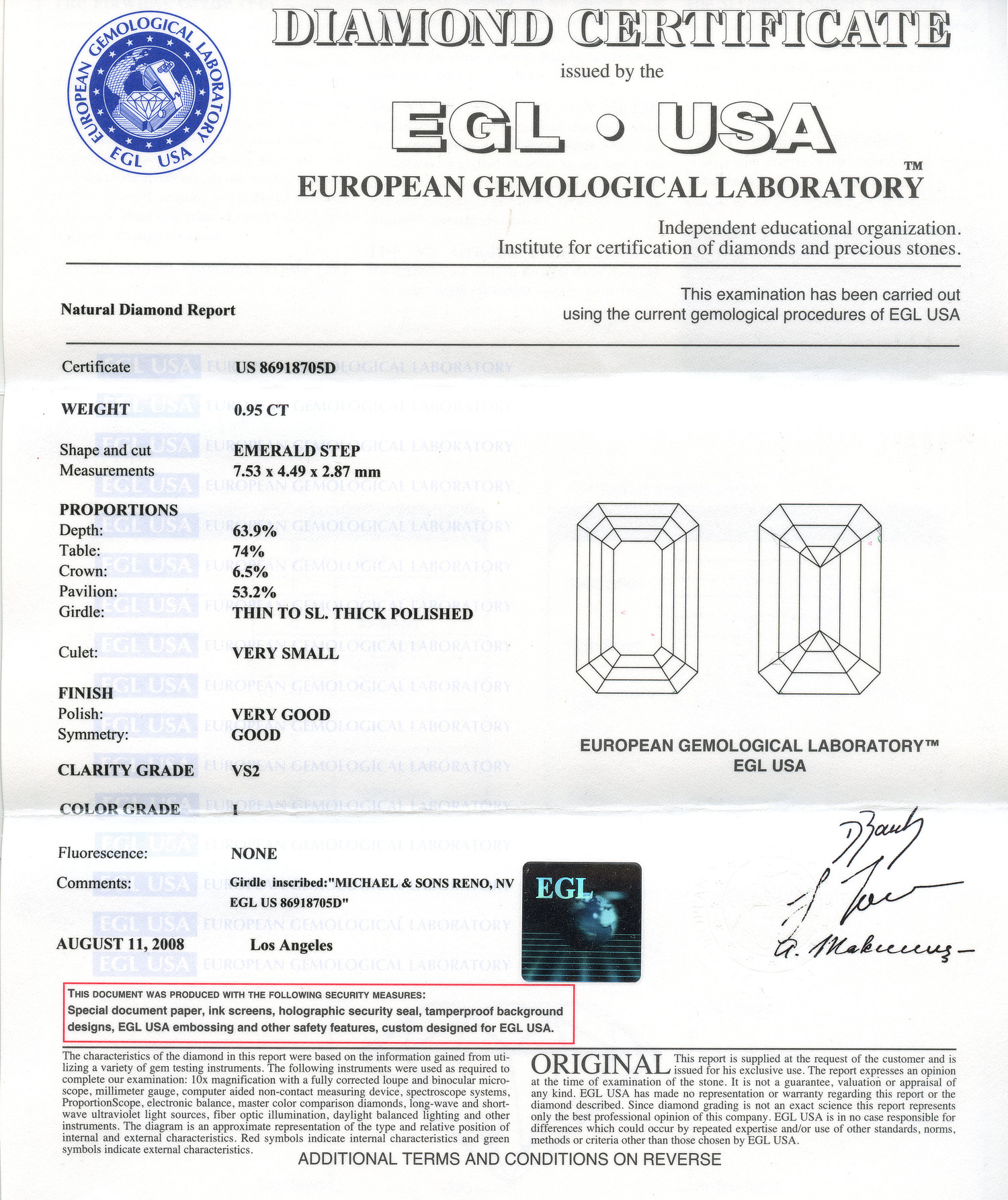 Loose EGL Certified 0.95ct Emerald Cut Diamond I/VS2. EGL cert # 86918705D is included in the sale.