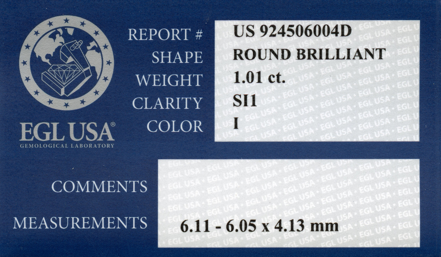 Loose EGL Certified 1.01ct Round Brilliant Cut Diamond I/SI2. EGL cert # 9924506004D is included in the sale.