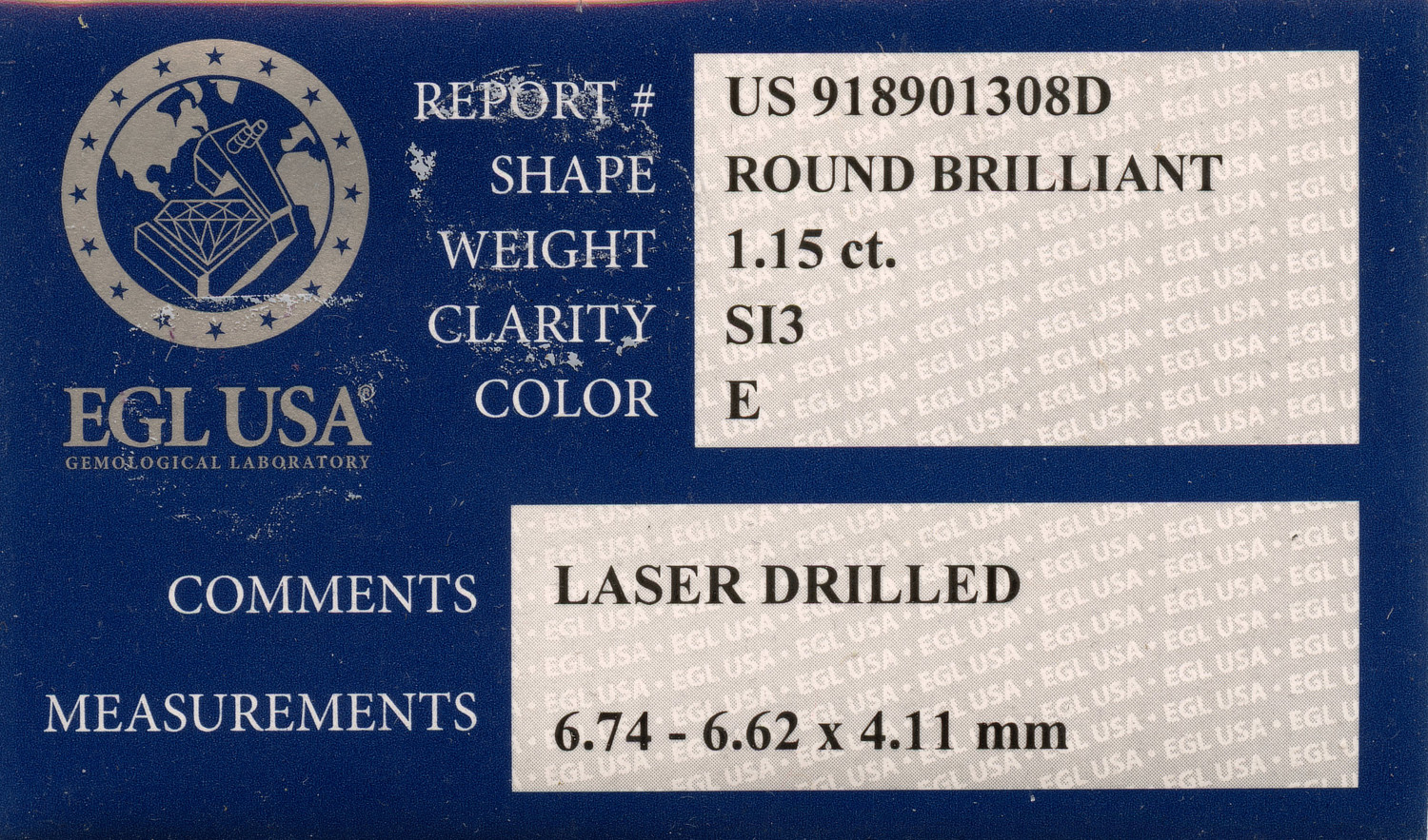 Loose EGL Certified 1.15ct Round Brilliant Cut Diamond E/SI3. EGL cert # 918901308D is included in the sale. Laser engraved!