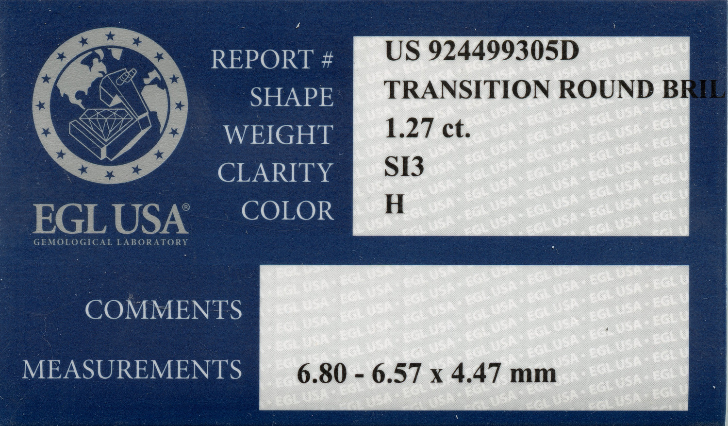 Loose EGL Certified 1.27ct Round Brilliant Cut Diamond H/SI3. EGL cert # 924499305D is included in the sale.