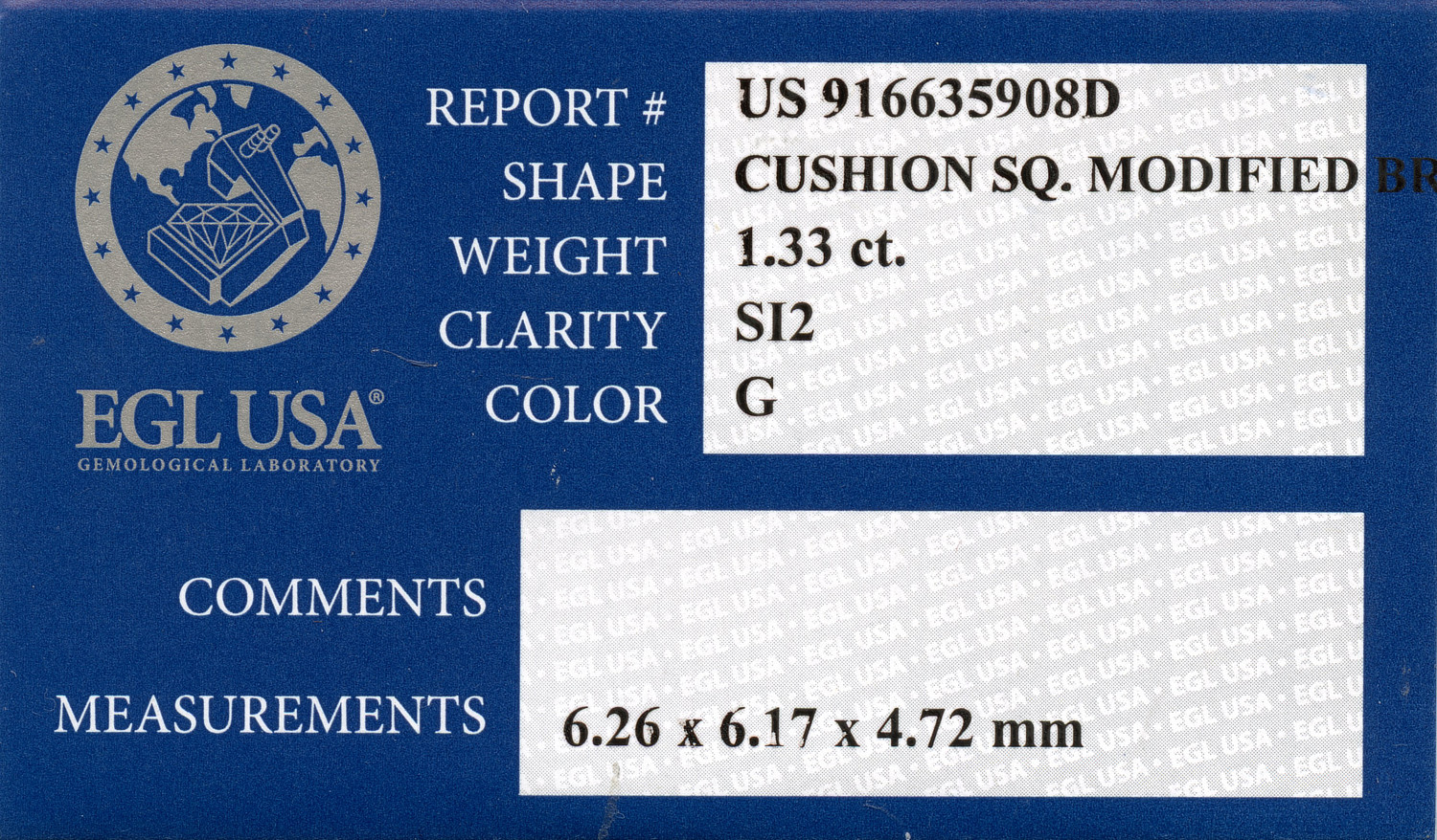 Loose EGL Certified 1.33ct Cushion Cut Diamond G/SI2. EGL cert # 916635908D is included in the sale.
