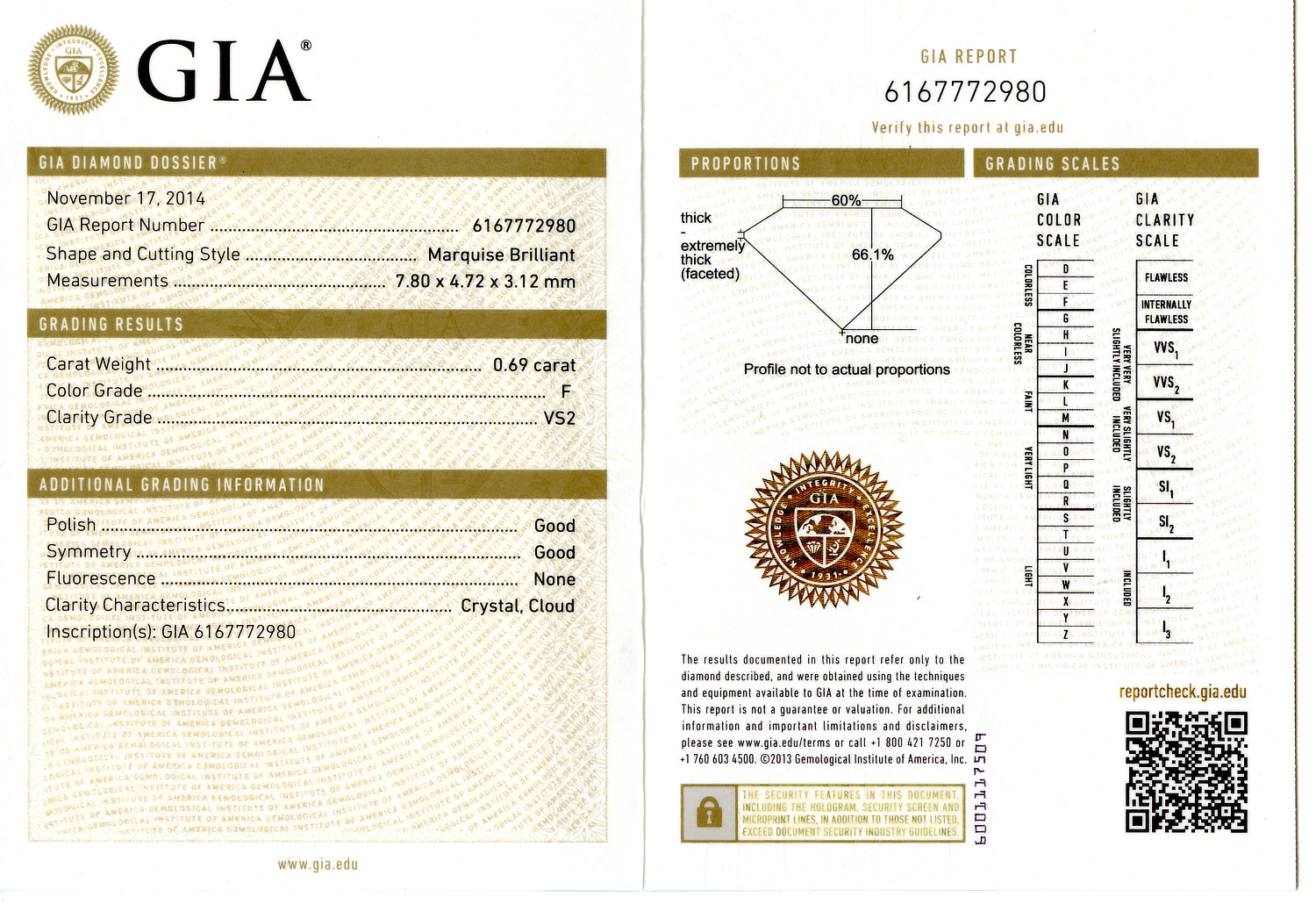 Loose GIA Certified 0.69ct Marquise Diamond F/VS2. GIA cert # 6167772980 is included in the sale.