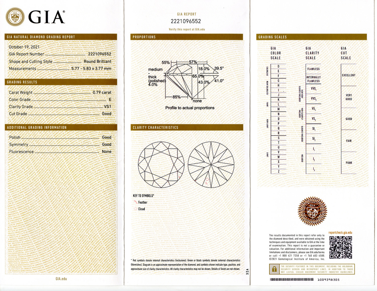 Loose GIA Certified 0.79ct Round Brilliant Cut Diamond E/VS1. GIA cert # 2221096552 is included in the sale.