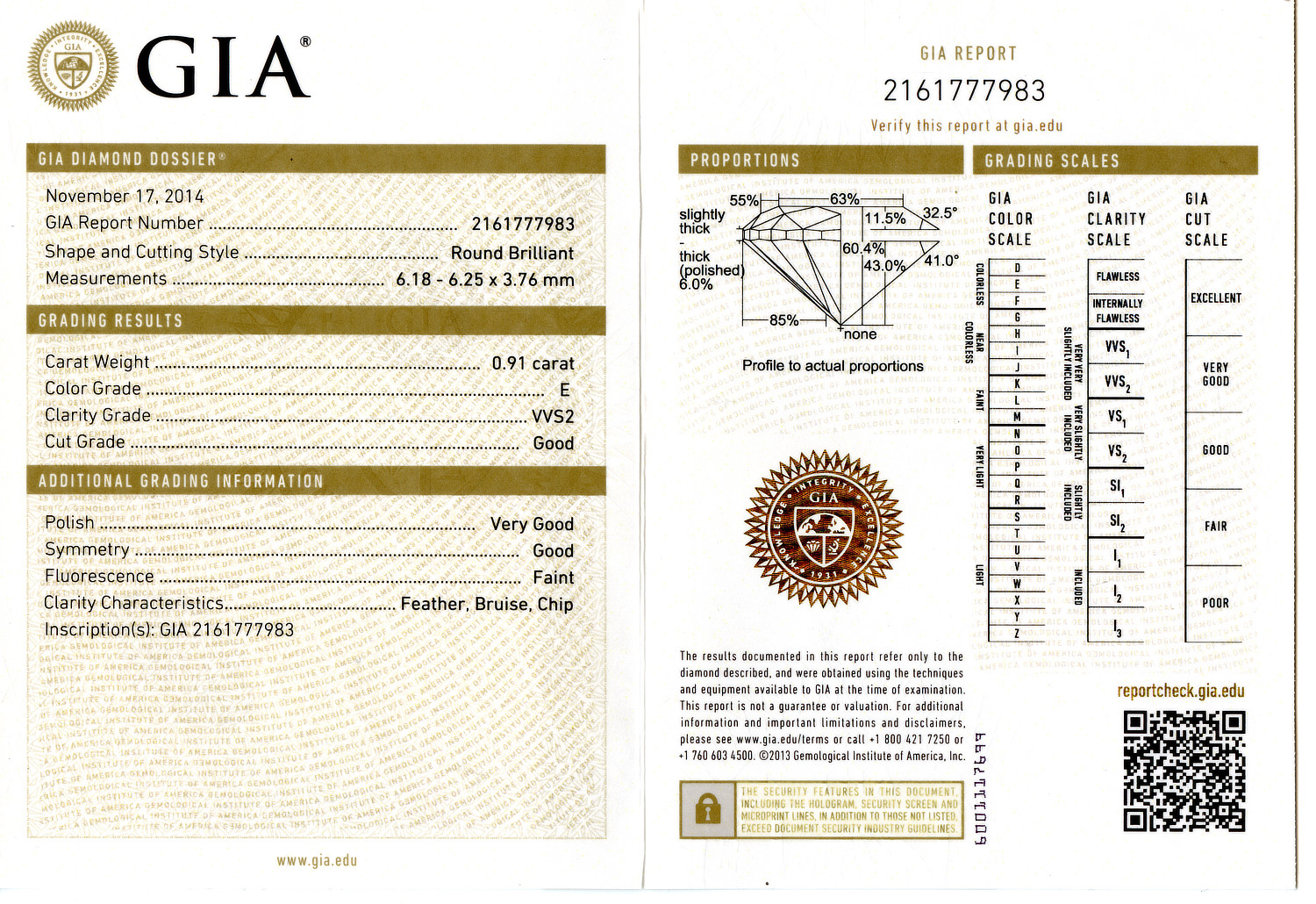Loose GIA Certified 0.91ct Round Brilliant Cut Diamond E/VVS2. GIA cert # 2161777983 is included in the sale.