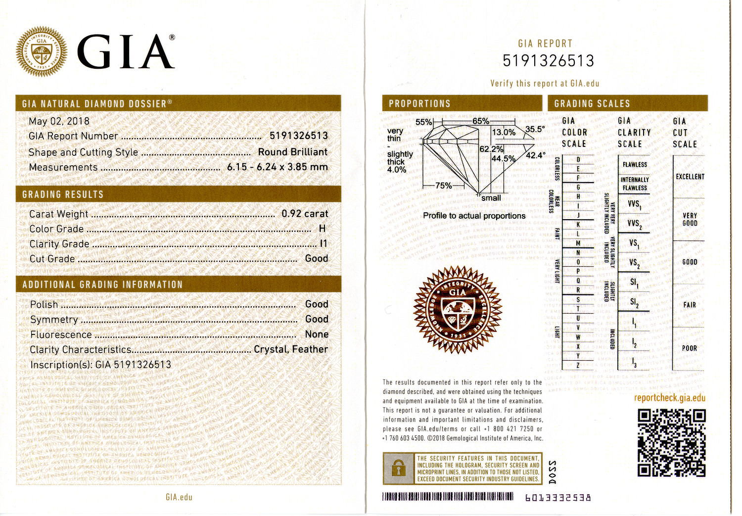 Loose GIA Certified 0.92ct Round Brilliant Cut Diamond H/I1. GIA cert # 5191326513 is included in the sale. Laser inscribed.