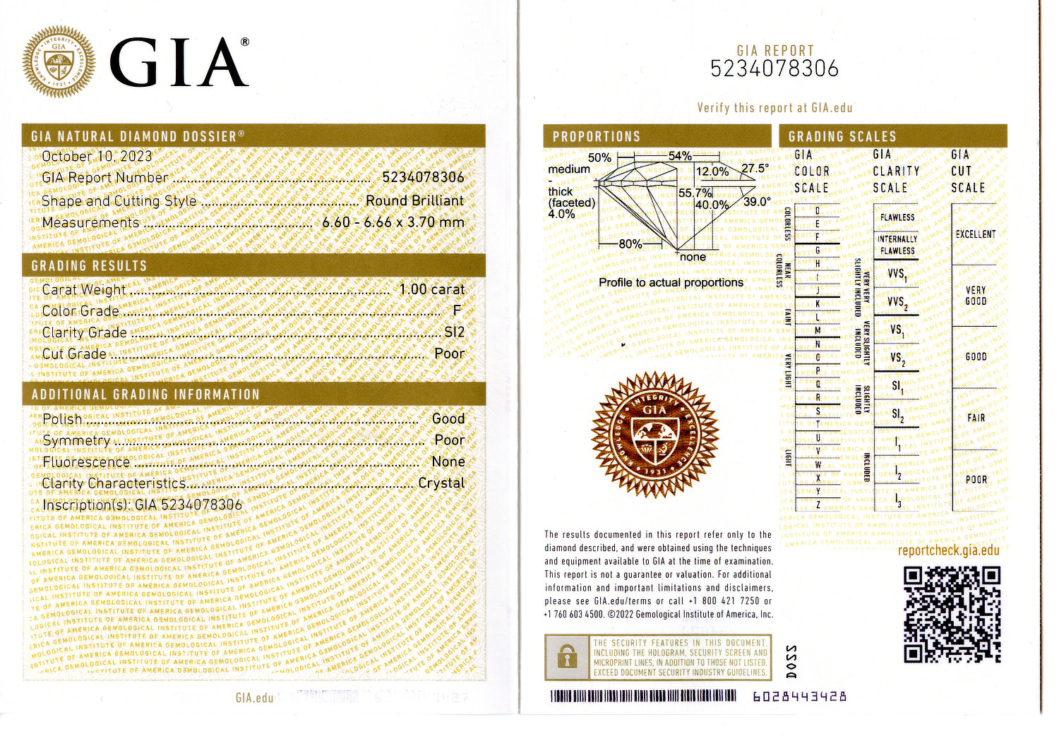 Loose GIA Certified 1.00ct Round Brilliant Cut Diamond F/SI2. GIA cert # 5234078306 is included in the sale. Laser inscribed.