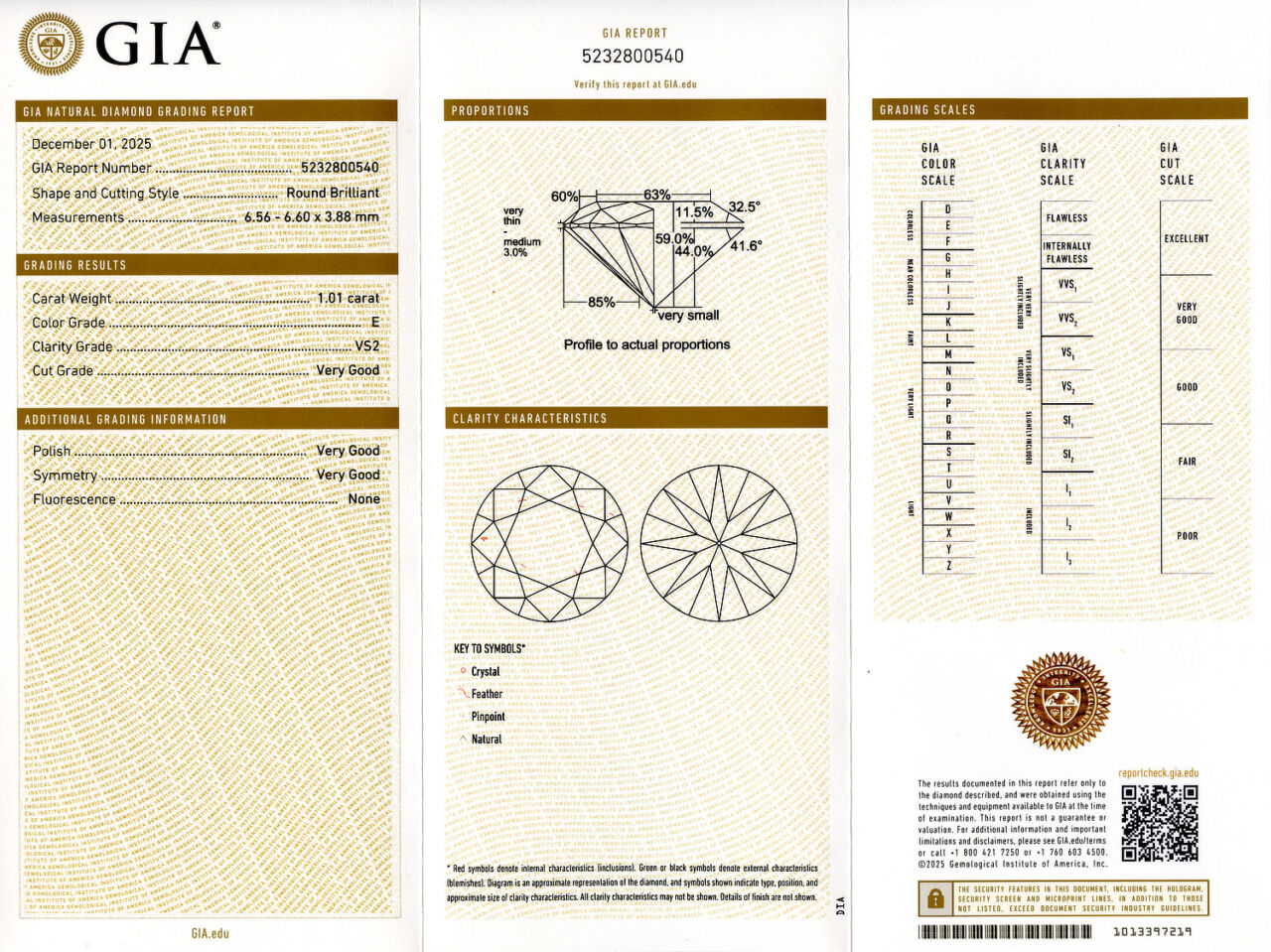 Loose GIA Certified 1.01ct Round Brilliant Cut Diamond E/VS2. GIA cert # 5232800540 is included in the sale.