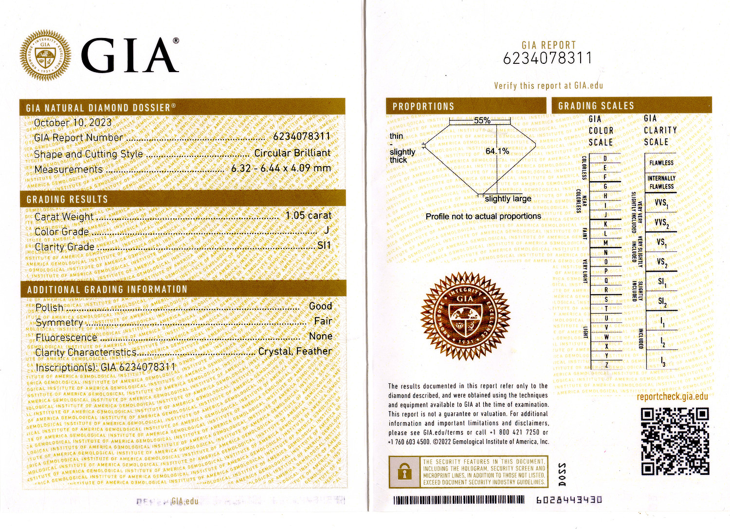 Loose GIA Certified 1.05ct Circular Brilliant Cut Diamond J/SI1. GIA cert # 6234078311 is included in the sale.