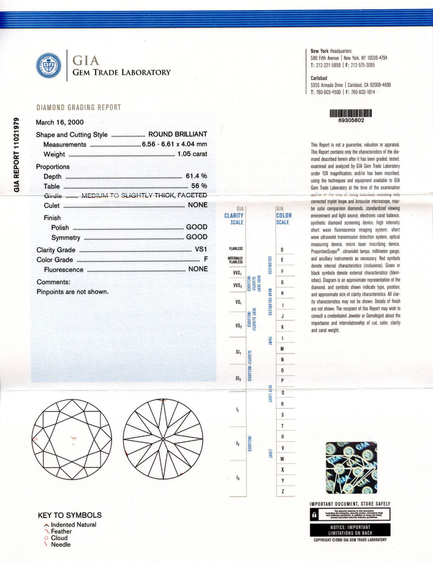 Loose GIA Certified 1.05ct Round Brilliant Cut Diamond F/VS1. GIA cert # 11021979 is included in the sale.