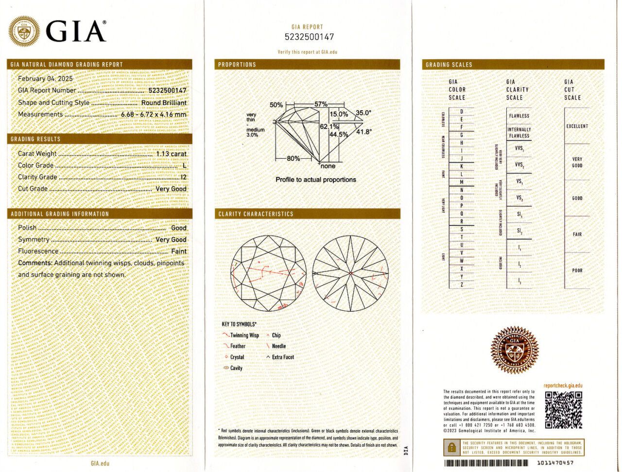 Loose GIA Certified 1.13ct Round Brilliant Cut Diamond L/I2. GIA cert # 5232500147 is included in the sale.