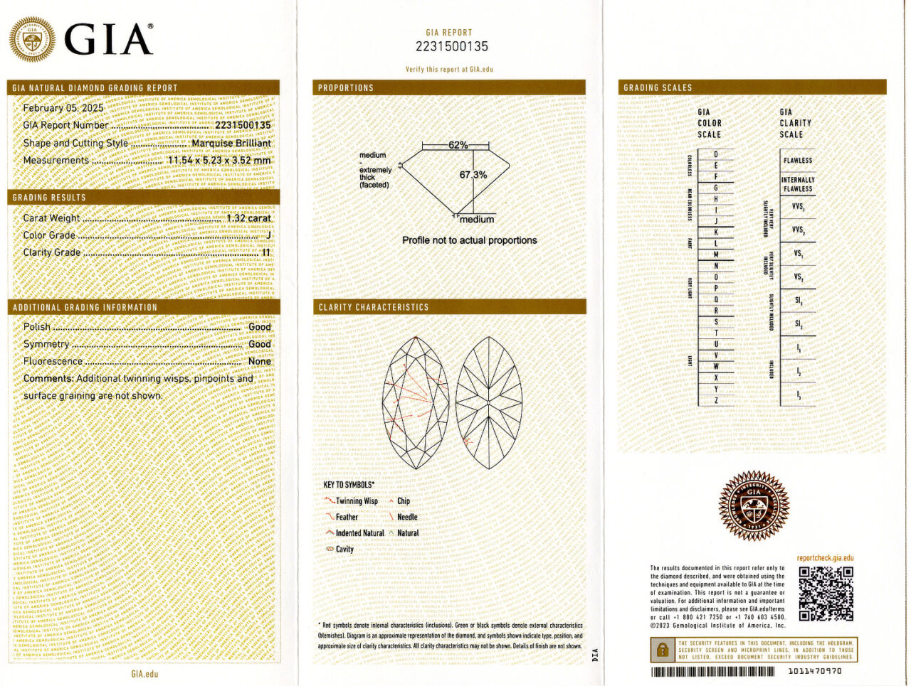 Loose GIA Certified 1.32ct Marquise Cut Diamond J/I1. GIA cert # 2231500135 is included in the sale.