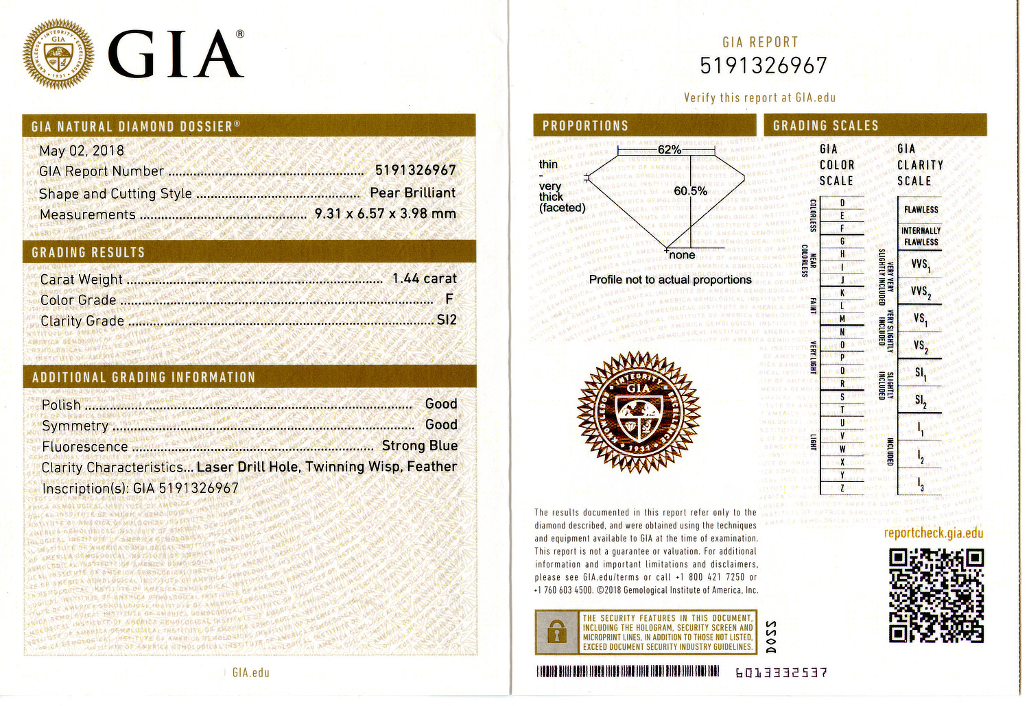 Loose GIA Certified 1.44ct Pear Brilliant Cut Diamond F/SI2. GIA cert # 5191326967 is included in the sale. Laser Drilled.