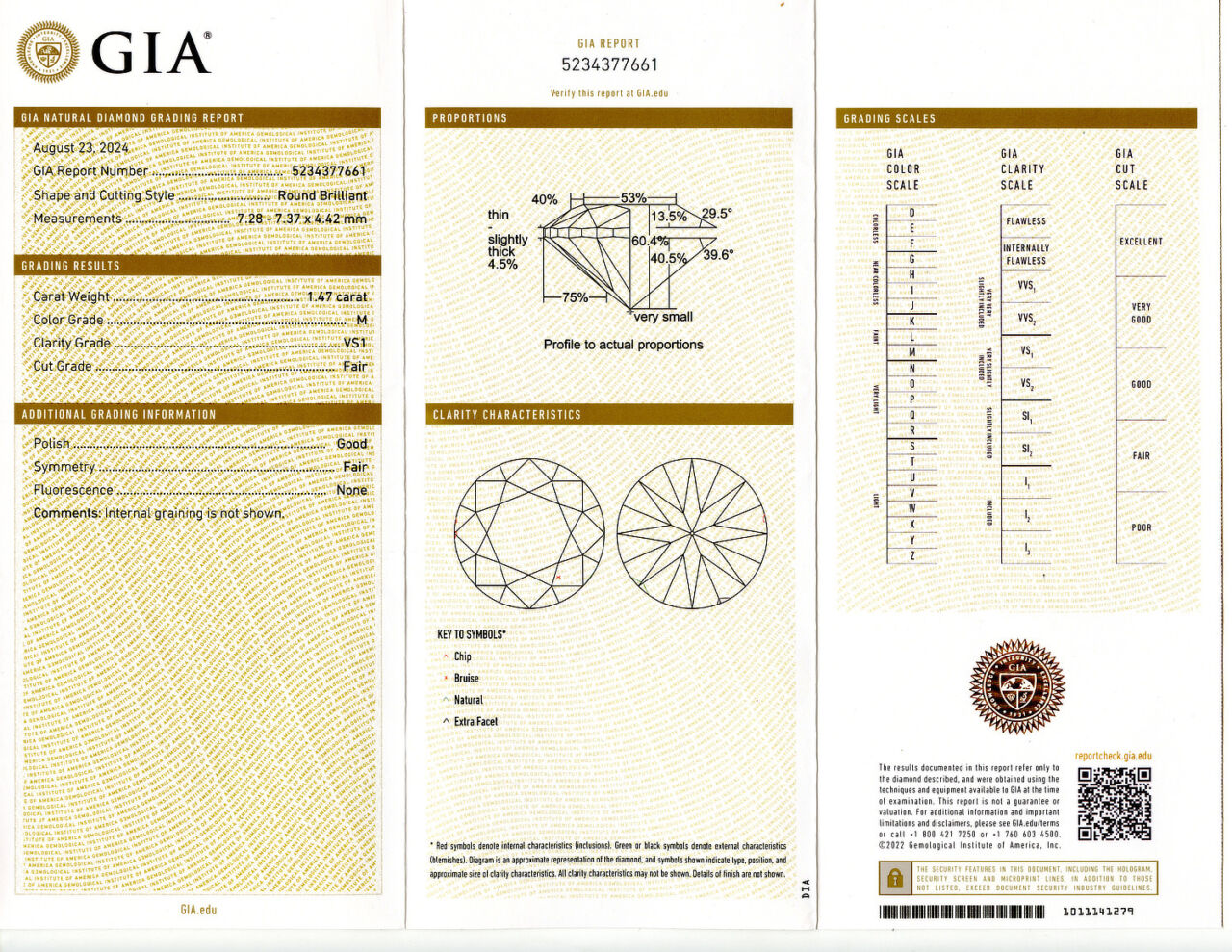 Loose GIA Certified 1.47ct Round Brilliant Cut Diamond M/VS1. GIA cert # 5234377661 is included in the sale.