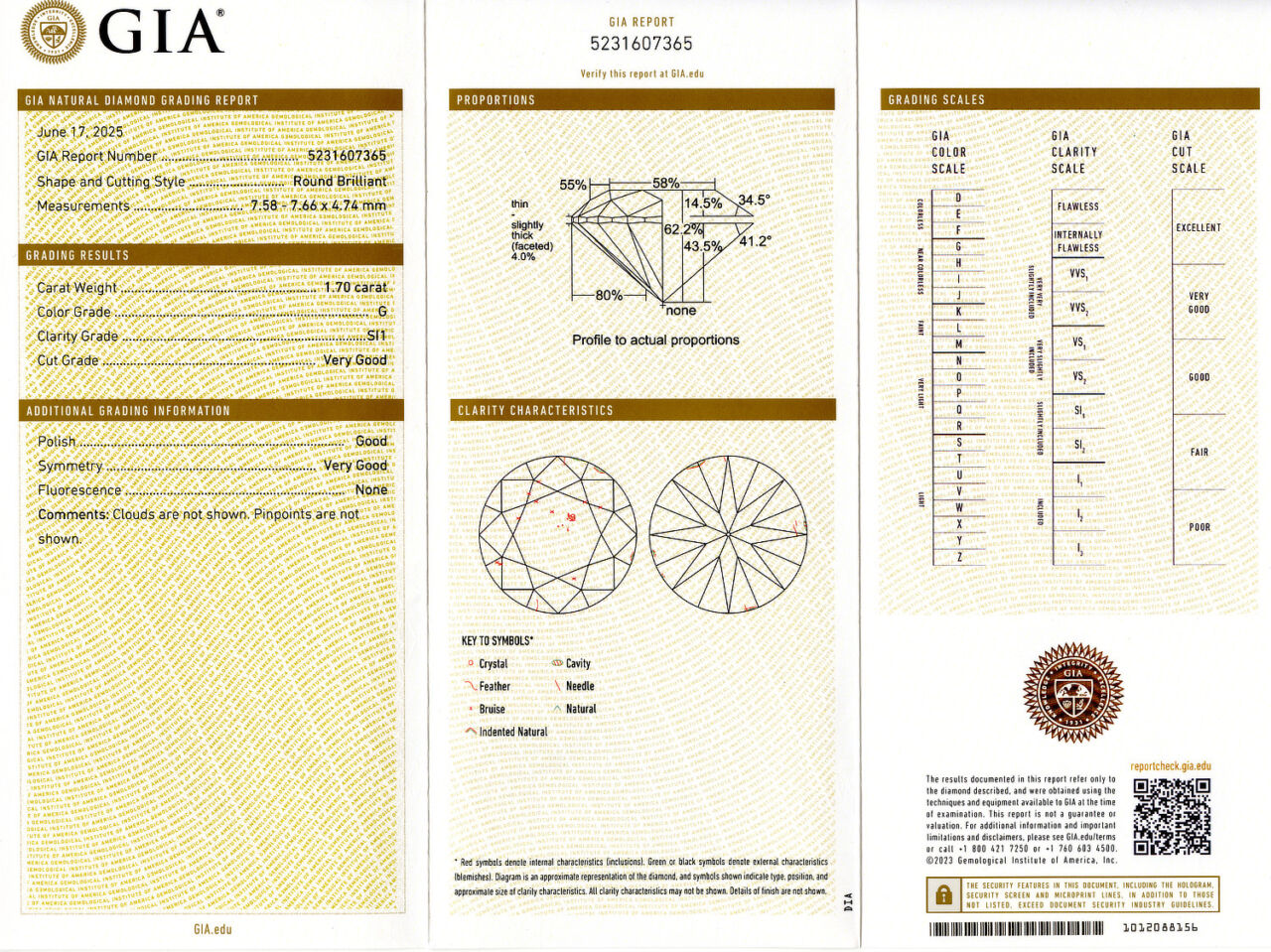 Loose GIA Certified 1.70ct Round Brilliant Cut Diamond G/SI1. GIA cert # 5231607365 is included in the sale.
