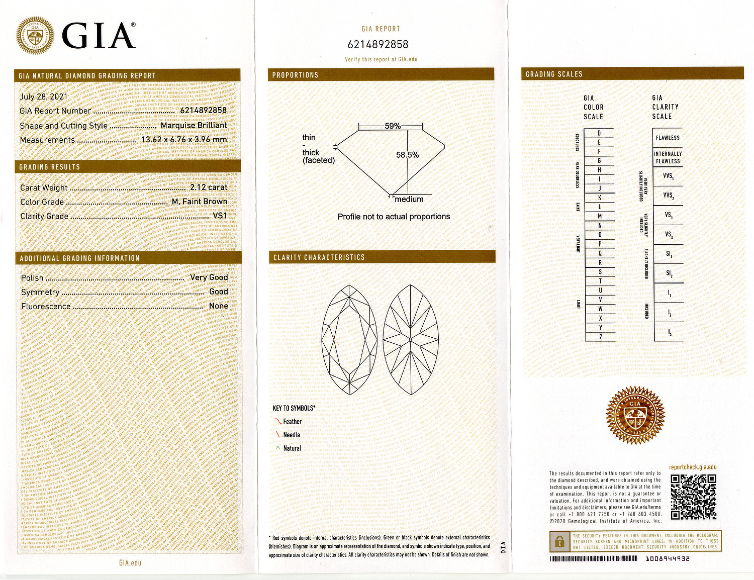 Loose GIA Certified 2.12ct Marquise Diamond M/VS1. GIA cert # 6214892858 is included in the sale.