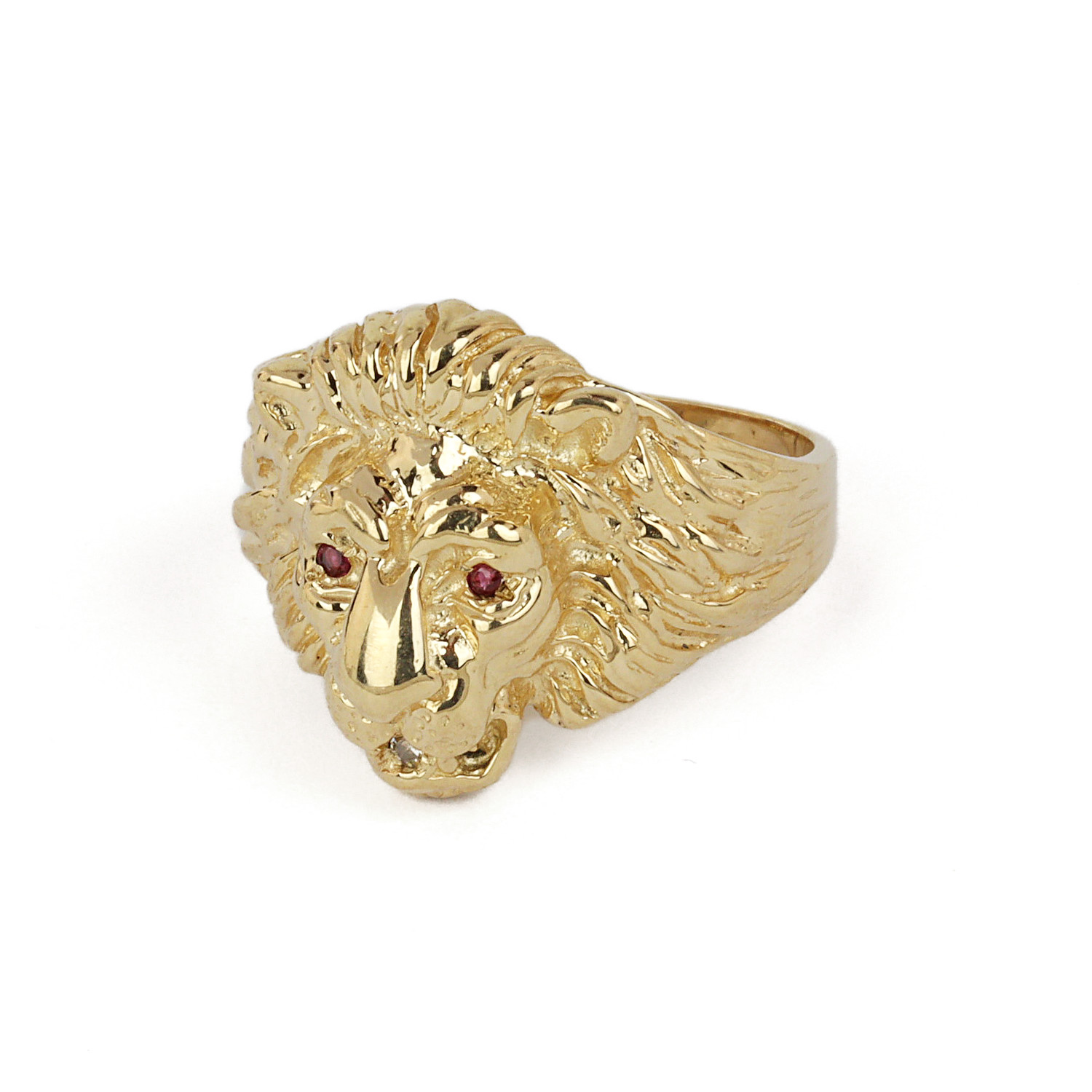 10k yellow gold ring featuring a lion’s head with ruby eyes (one is chipped) and a clear stone in his mouth. Fits a size 9.5 finger, measures 18mm wide across the top, and weighs 9.6 grams.