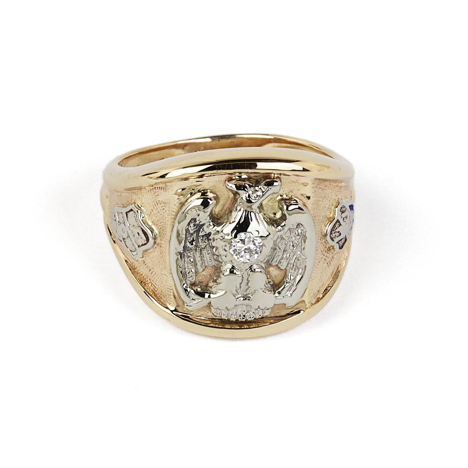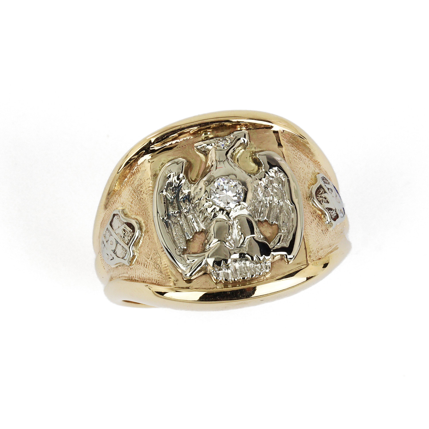 10k yellow and white gold ring featuring an eagle design with a 0.12 carat diamond (VS1 clarity/G-H-I color). Fits a size 10.5 finger, measures 19mm wide across the top, and weighs 11.4 grams.