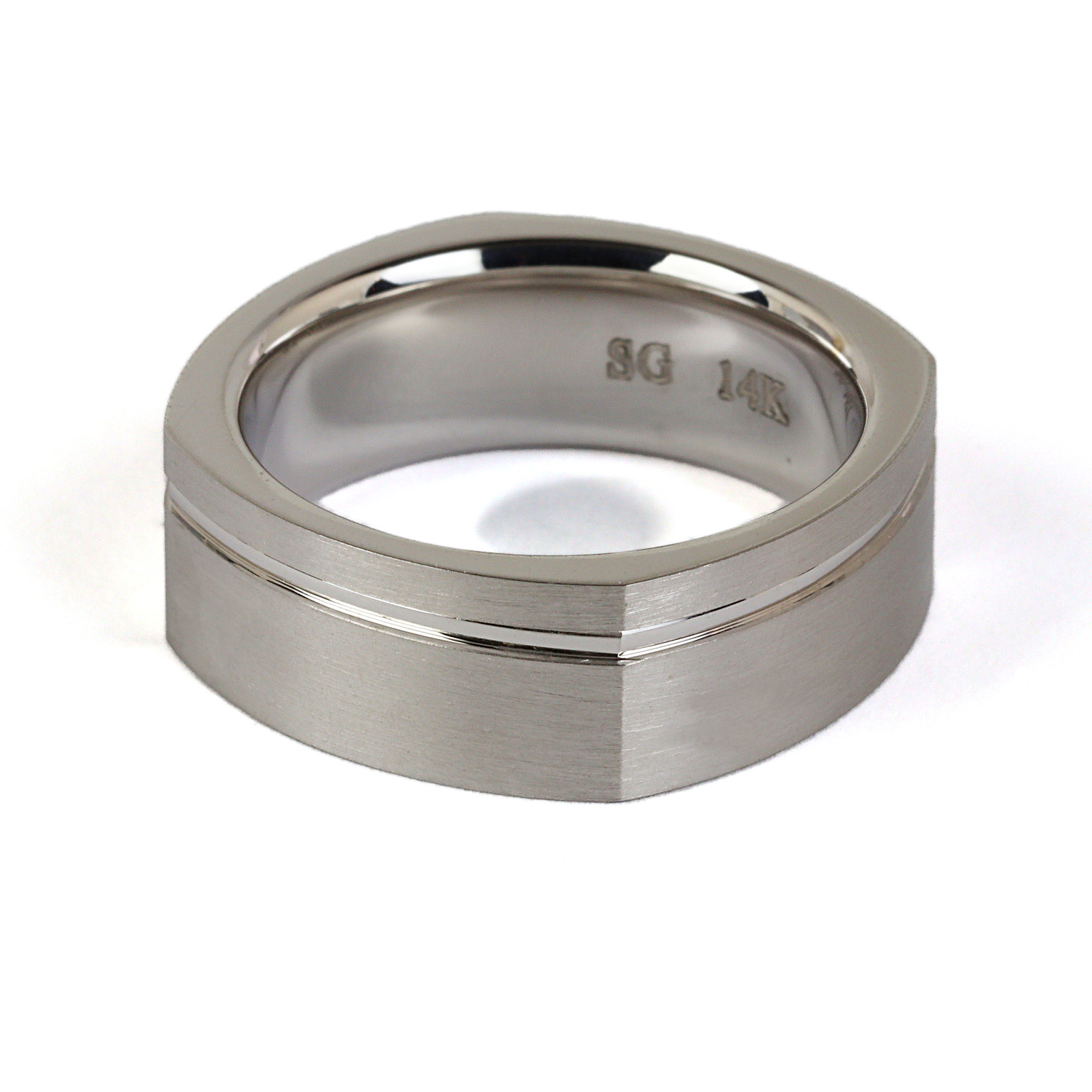 14k white gold band. It fits a size 10 finger, measures 8mm wide, and weighs 15.9 grams.