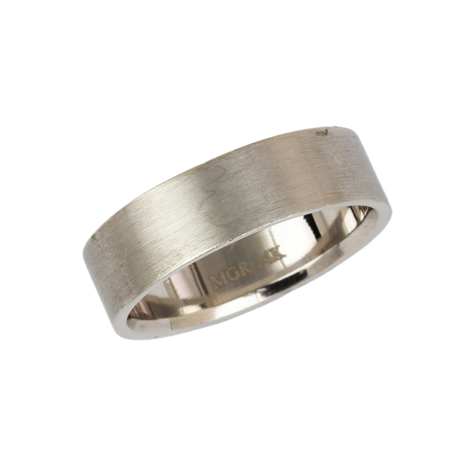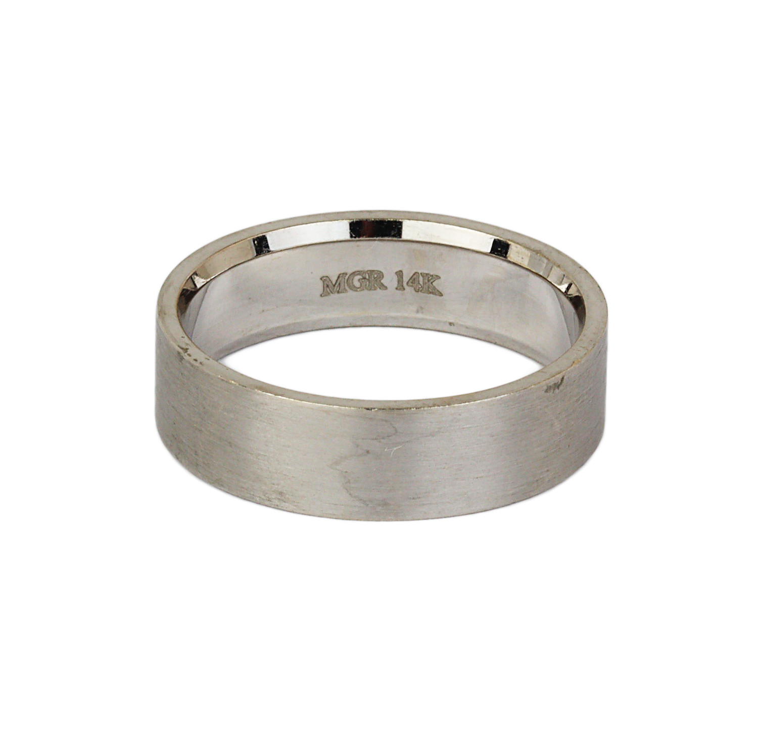 14k white gold band. It measures 6mm wide, fits a size 9.25 finger, and weighs 7.1 grams.