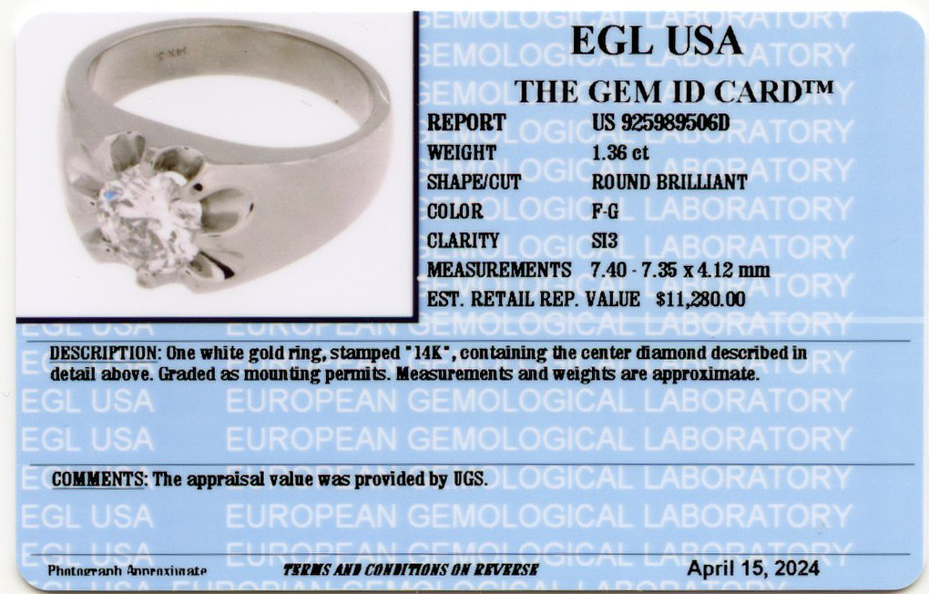 14k white gold ring with a 1.36 carat (SI3 clarity/F-G color) round brilliant cut diamond. Fits a size 9.25 finger, measures 10mm wide across the top, and weighs 11.6 grams.