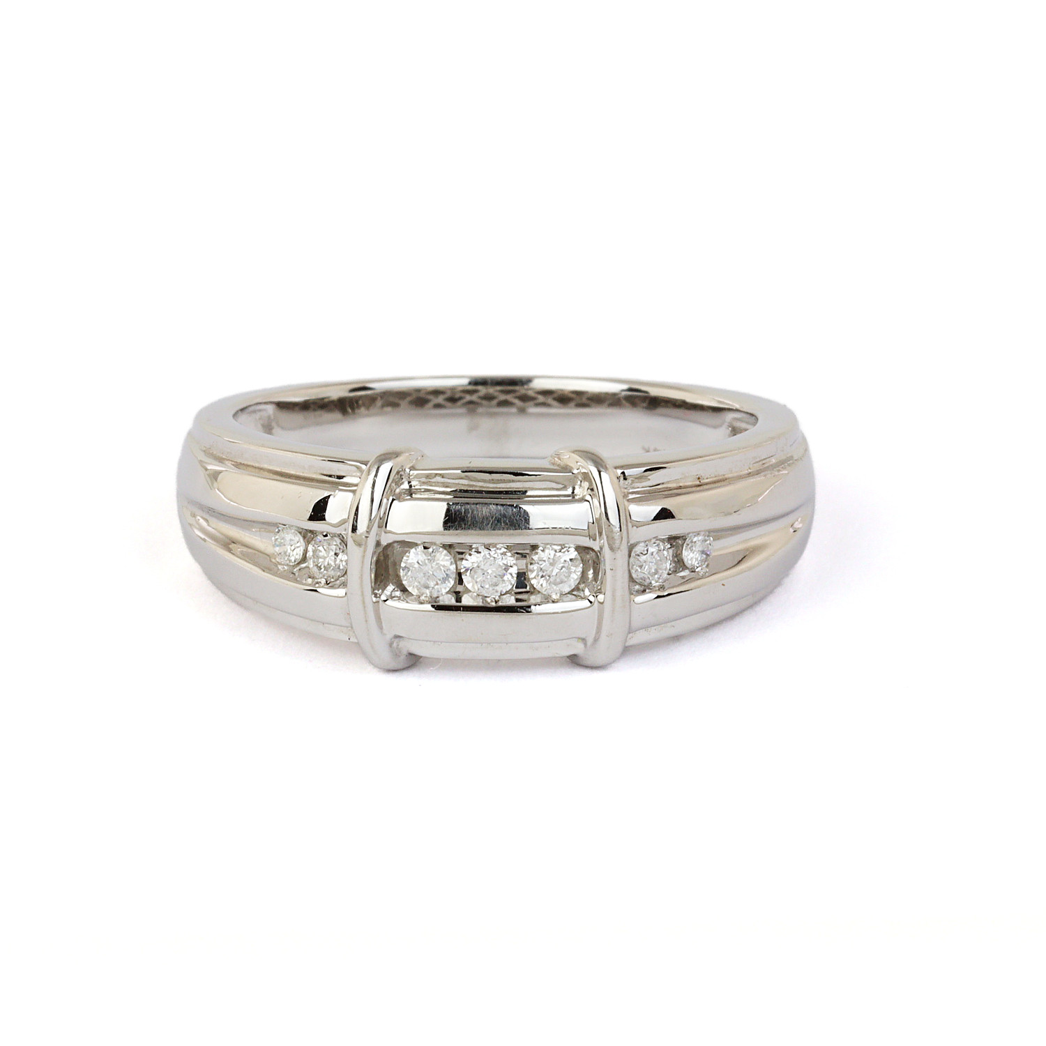 14k white gold ring with diamonds which amount to approximately 0.20 carat TW (I1 clarity/F-G-H color). Fits a size 10.5 finger, measures 9mm wide across the top, and weighs 6.7 grams.