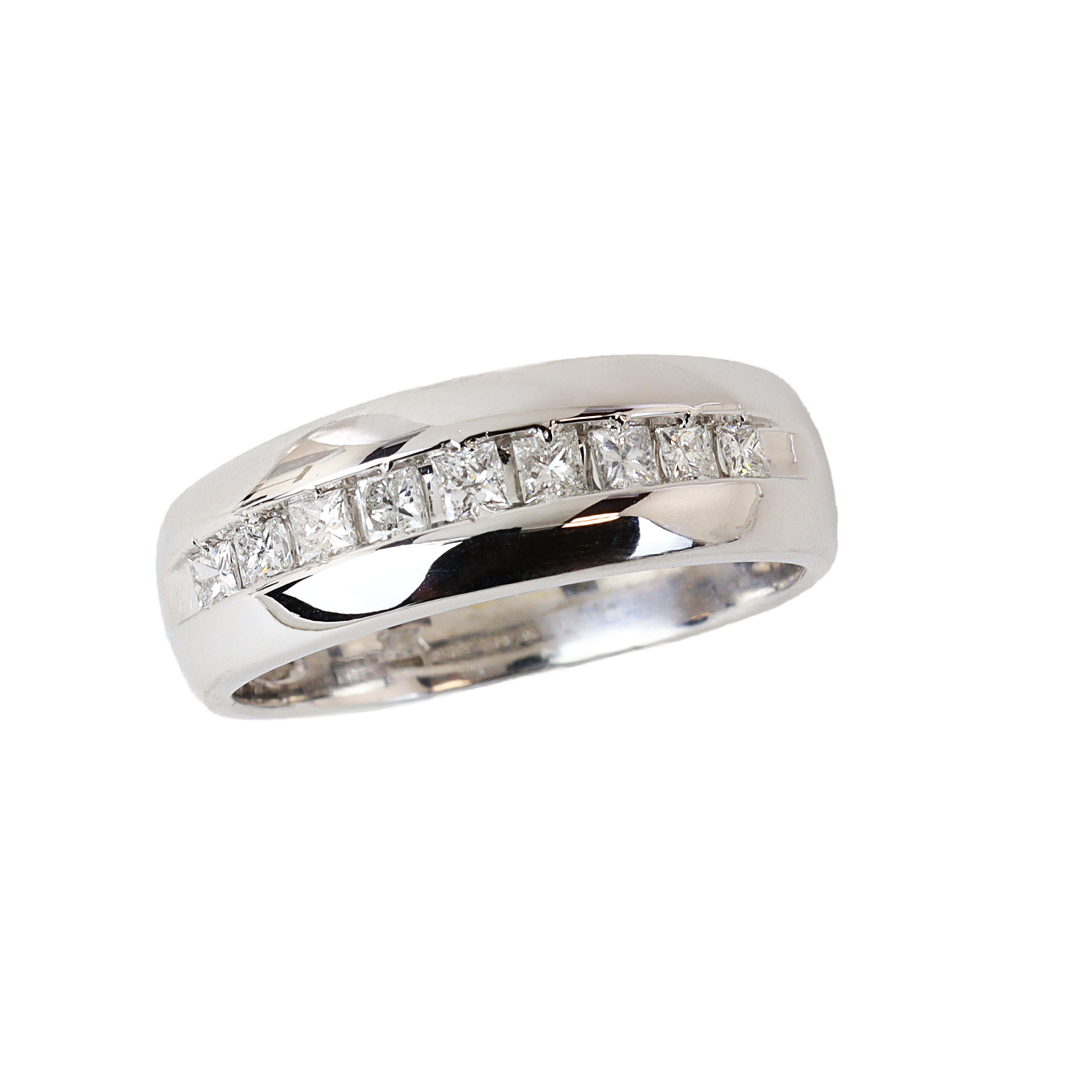 14k white gold ring with diamonds which amount to approximately 0.60 carat TW (SI1-I1 clarity/H-I-J color). Fits a size 9.25 finger, measures 8mm wide across the top, and weighs 5.3 grams.