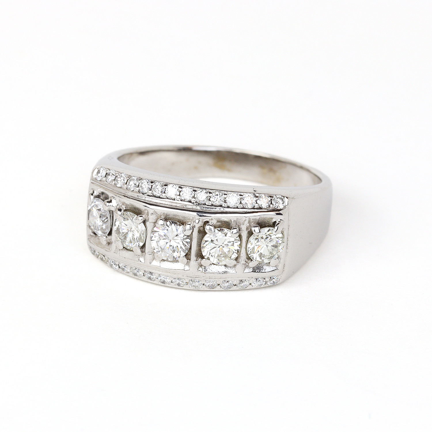 14k white gold ring with diamonds which amount to approximately 1.25 carat TW (VS2-I1 clarity/G-H-I color). Fits a size 9.25 finger, measures 10mm wide across the top, and weighs 10.8 grams.