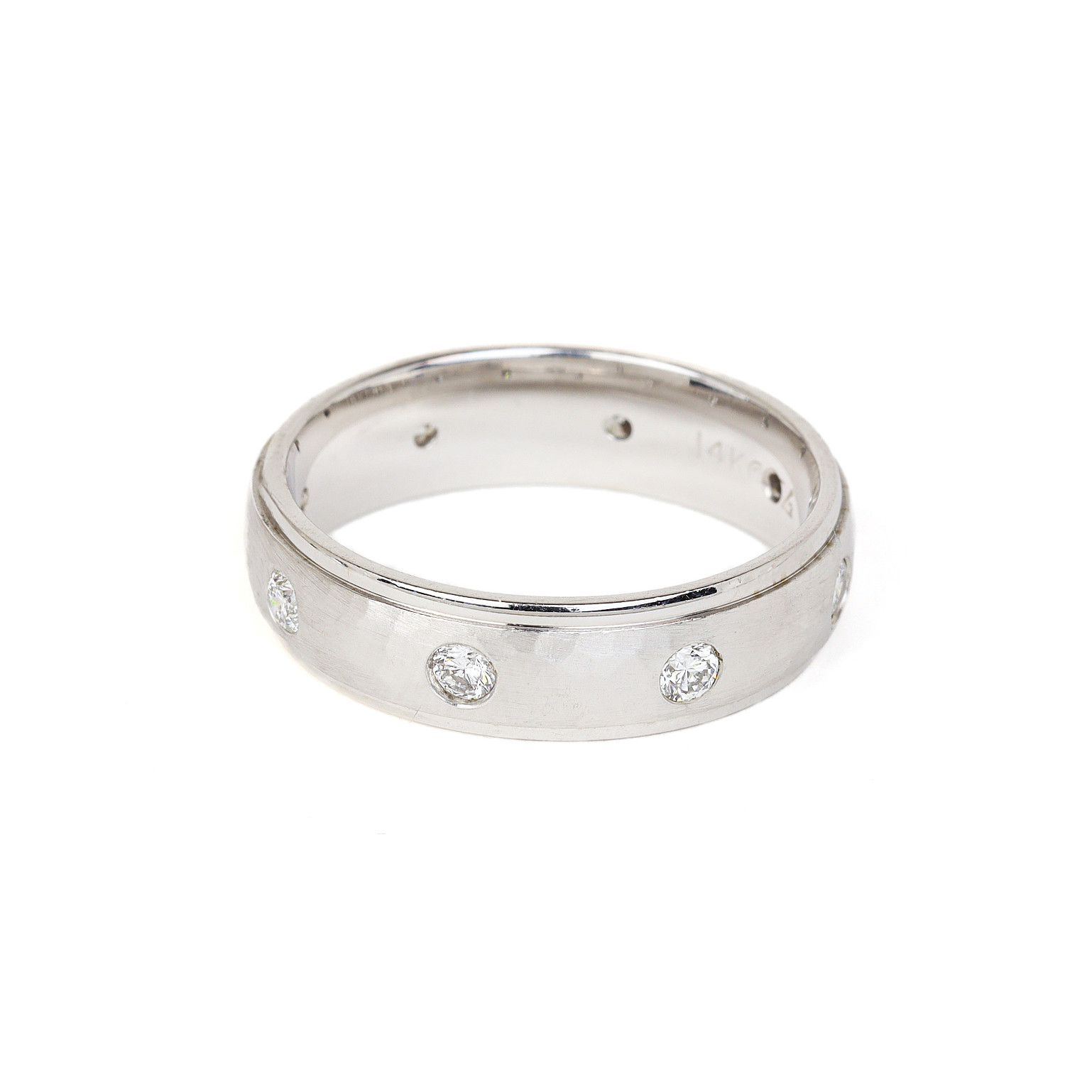 14k white gold ring with diamonds which amount to approximately 0.48 carat TW (SI1-SI2 clarity/G-H-I color). Fits a size 10 finger, measures 6mm wide, and weighs 7.4 grams.
