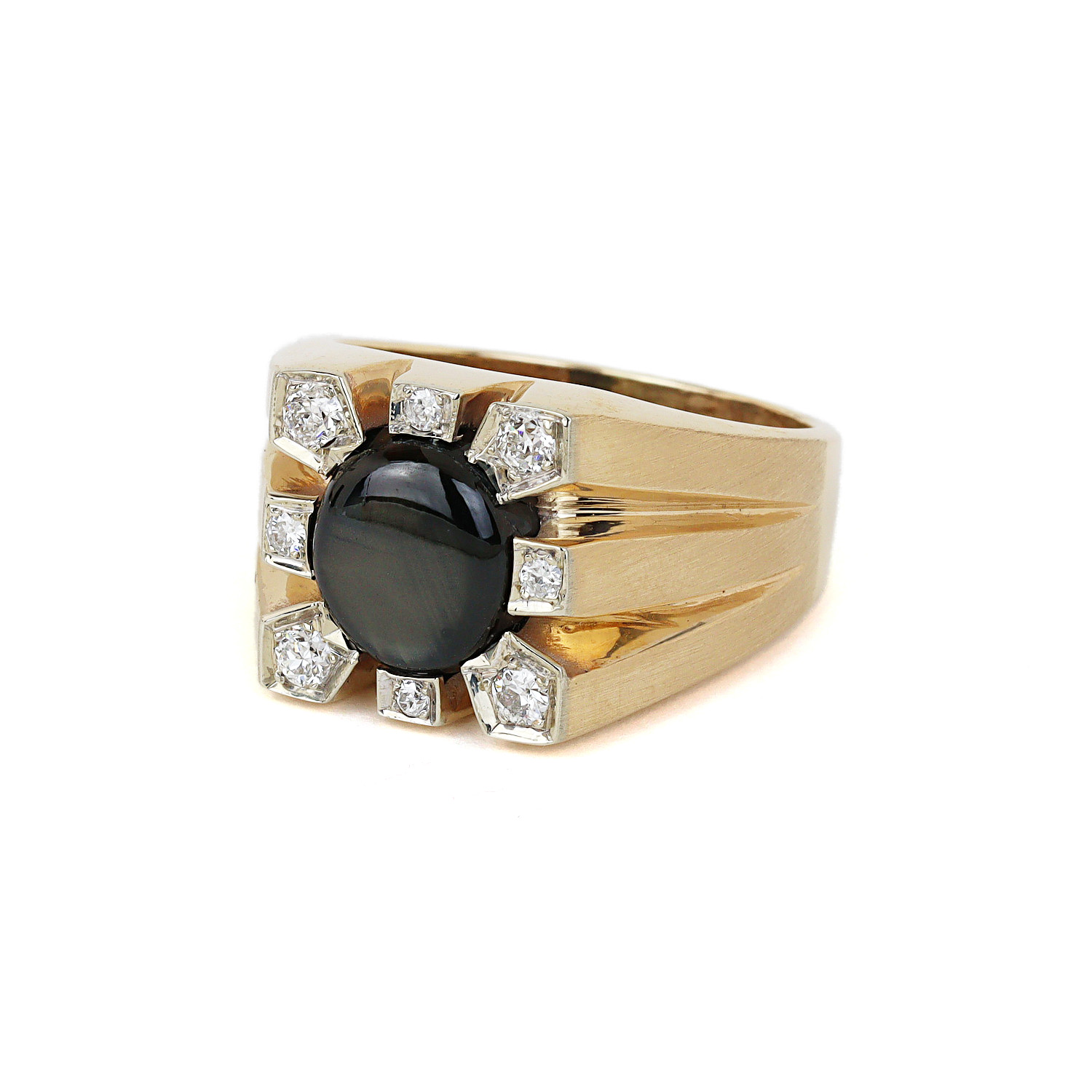 14k yellow gold ring with a 10mm in diameter black star sapphire stone and diamonds which amount to approximately 0.30 carat TW (VS2-I1 clarity/G-H-I color). Fits a size 10.25 finger, measures 15mm wide across the top, and weighs 13.7 grams.