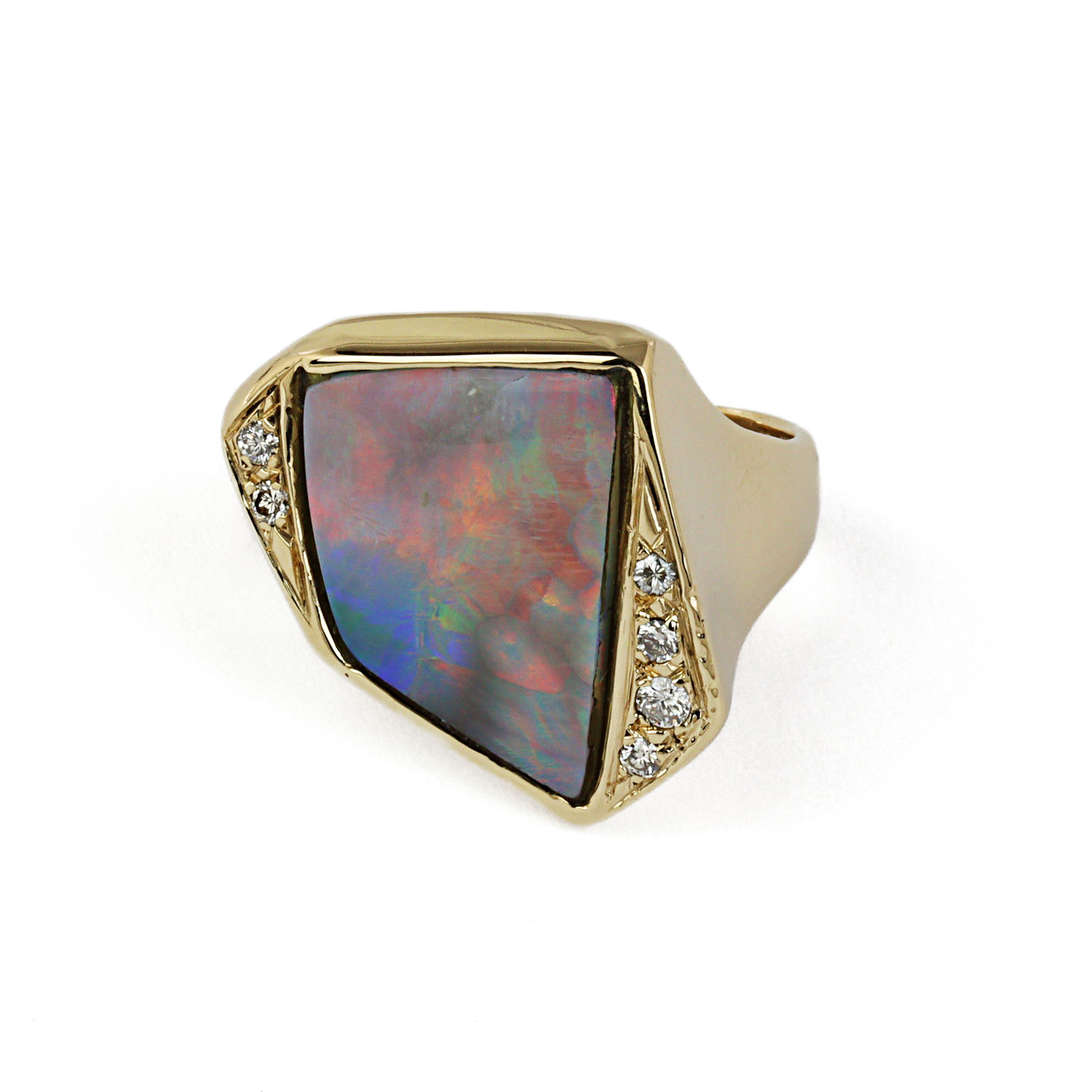 14k yellow gold men’s pinky ring containing a 12mm by 18mm Nevada shaped opal and diamond accents which amount to approximately 0.15 carat TW (SI2-I1 clarity/H-I-J color). Fits a size 7.25 finger, measures 21mm wide across the top, and weighs 11.9 grams.