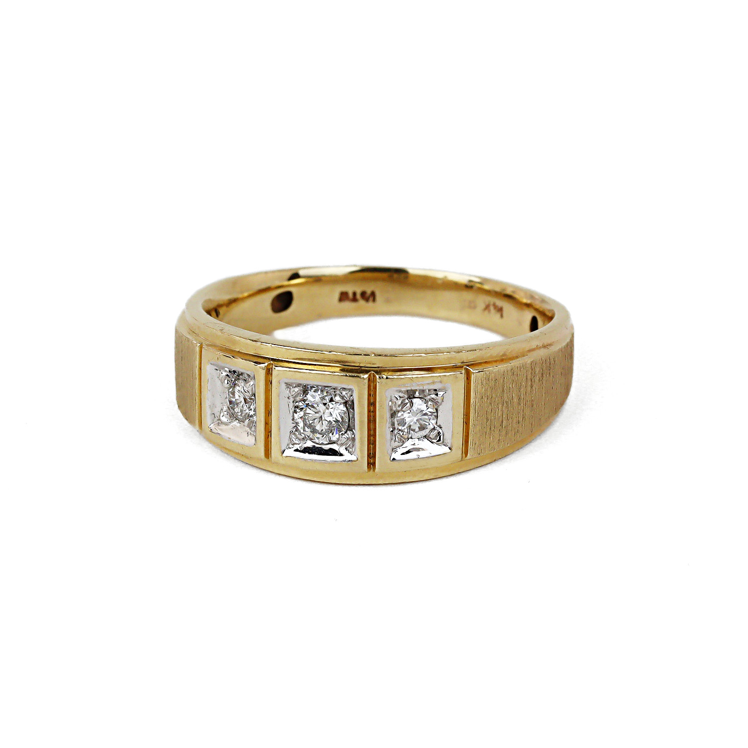 14k yellow gold ring with diamonds which amount to approximately 0.30 carat TW (I1 clarity/H-J color). Fits a size 11.25 finger, measures 9mm wide across the top, and weighs 6.6 grams.