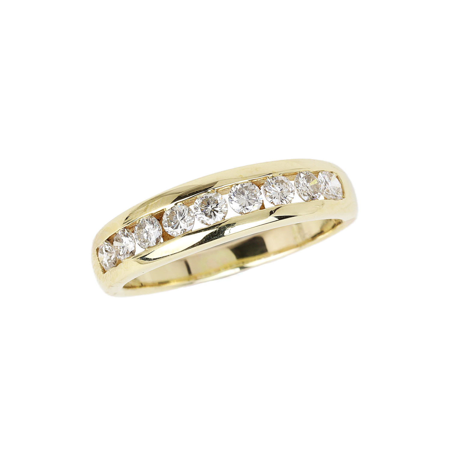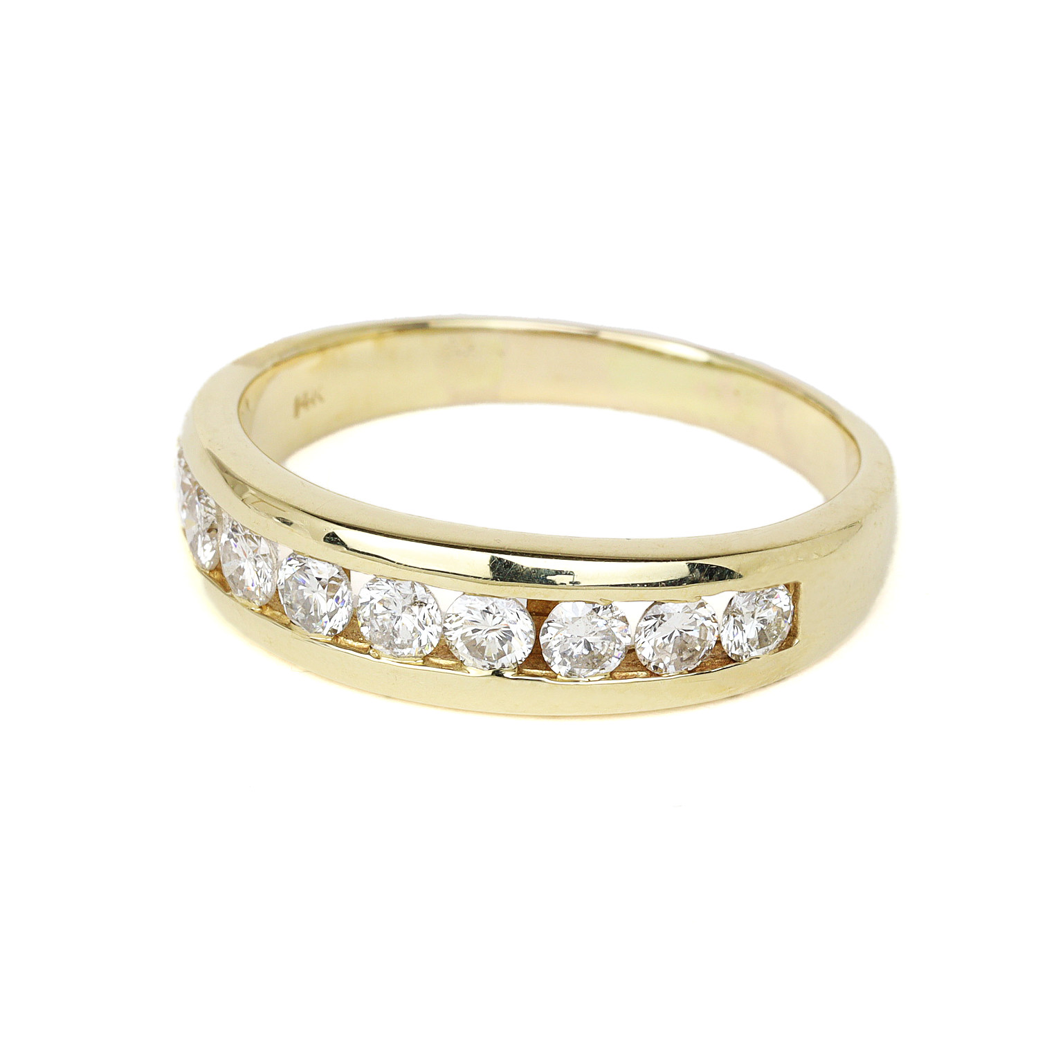 14k yellow gold ring with diamonds which amount to approximately 1.00 carat TW (SI2 clarity/G-H-I color). Fits a size 10.75 finger, measures 6mm wide across the top, and weighs 5.9 grams.