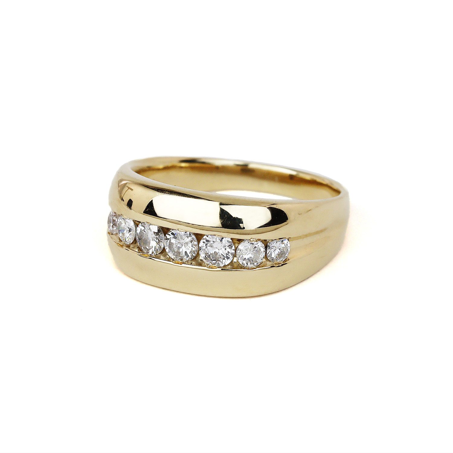 14k yellow gold ring with diamonds which amount to approximately 1.00 carat TW (I1 clarity/H-I-J color). Fits a size 11.75, measures 11mm wide across the top, and weighs 8.4 grams.