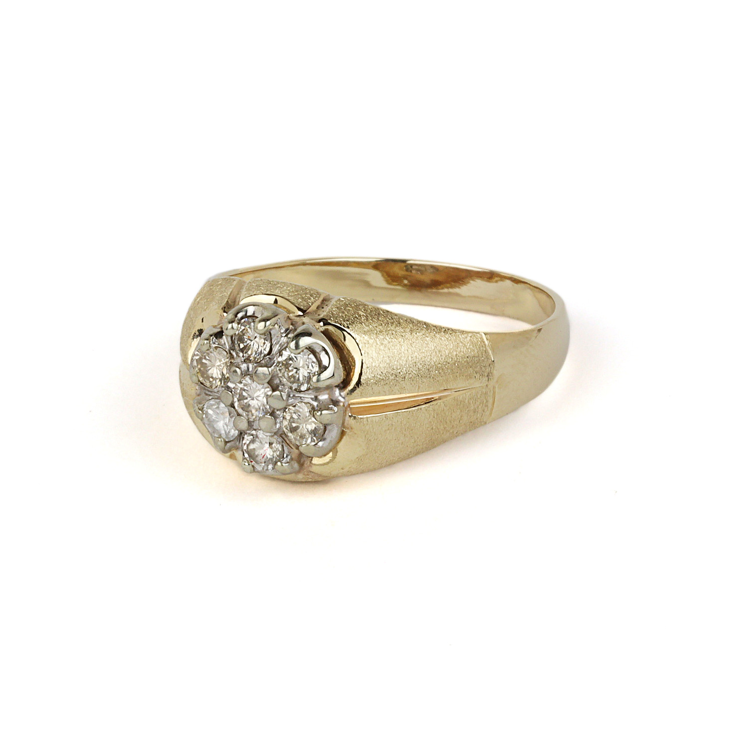 14k yellow gold ring with diamonds which amount to approximately 0.56 carat TW (SI1-I1 clarity/light brown color). Fits a size 11.5 finger, measures 13mm wide across the top, and weighs 7.0 grams.