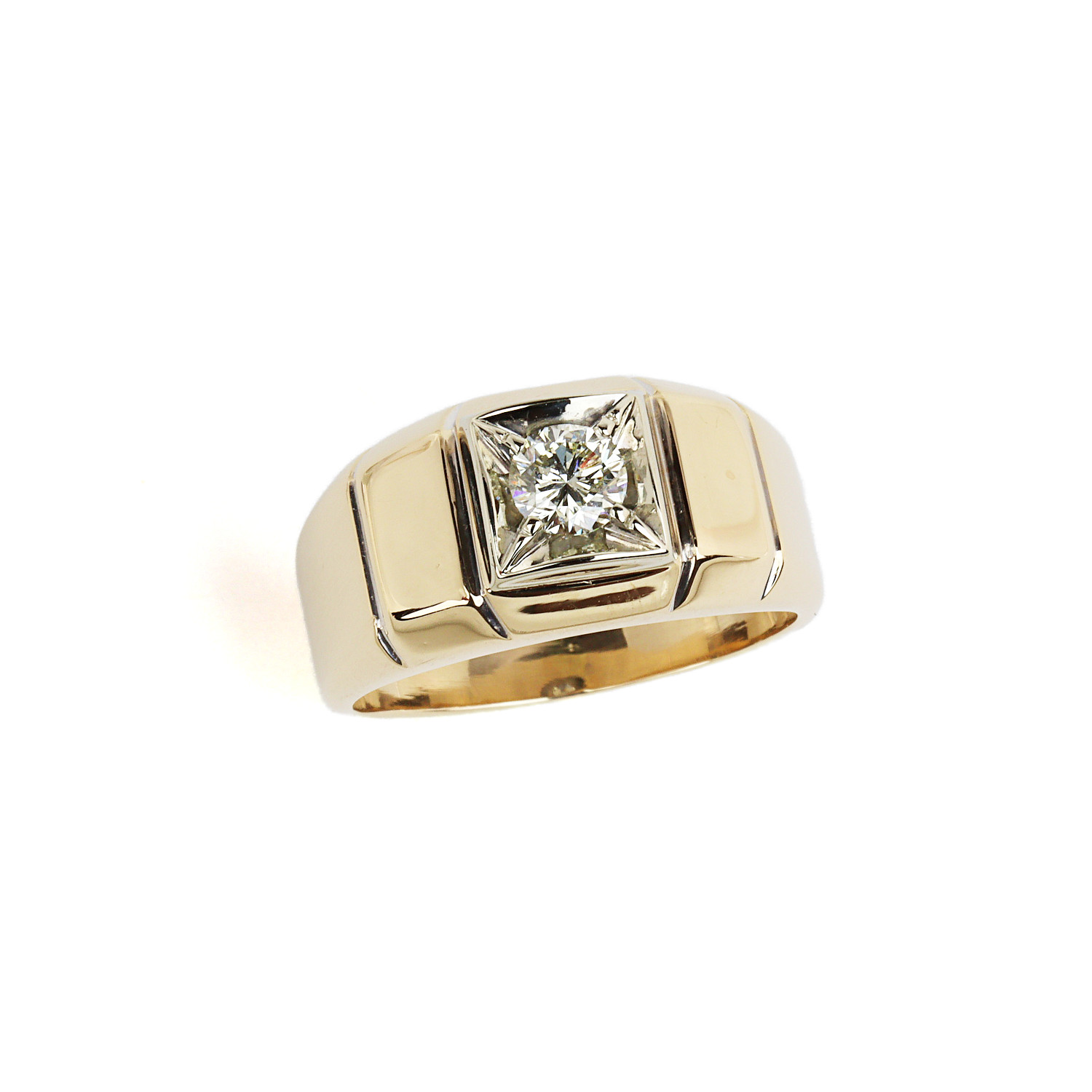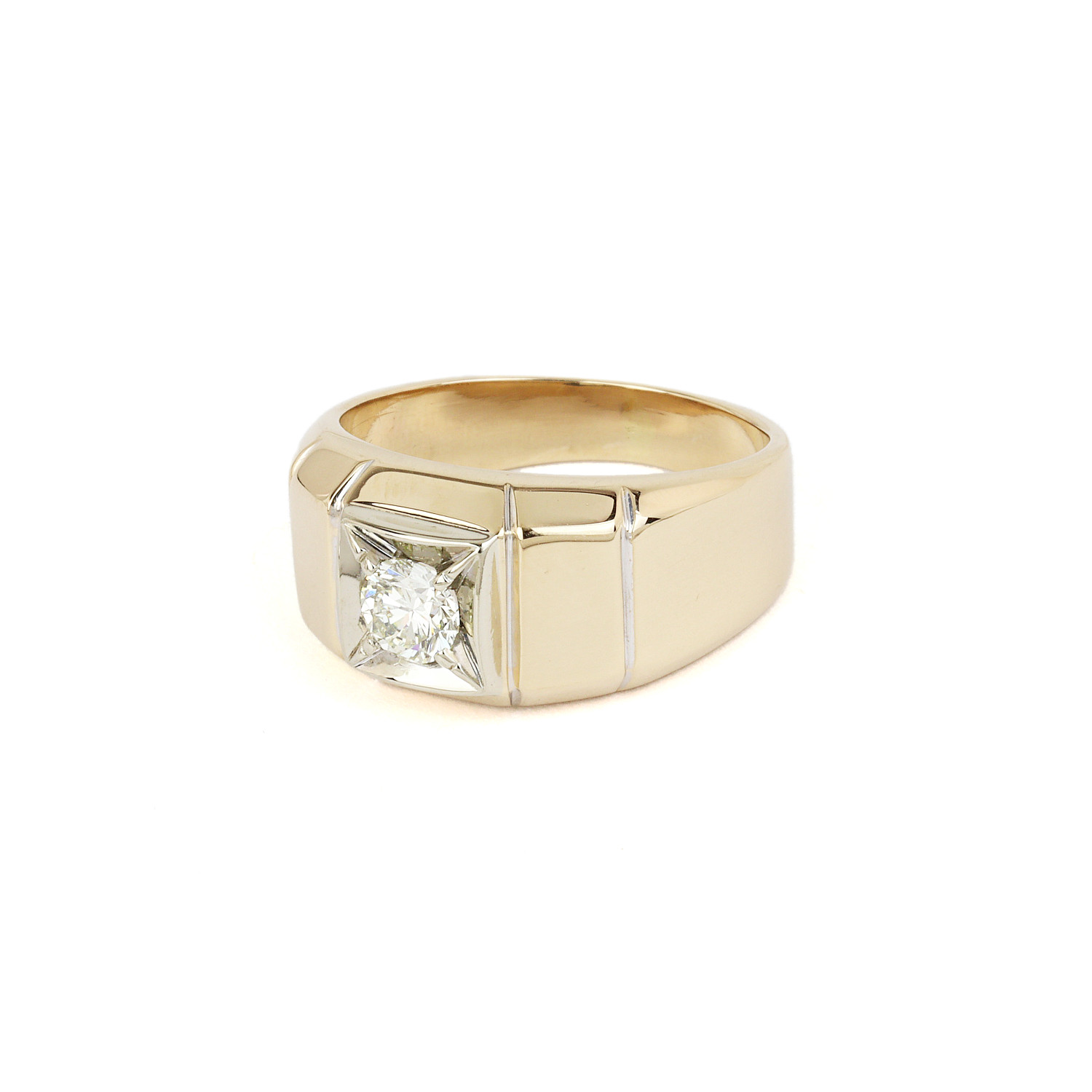 14k yellow & white gold ring with a 0.58 carat (VS1 clarity/H-I-J color) round brilliant cut diamond. Fits a size 9.75 finger, measures 12mm wide across the top, and weighs 10.9 grams.