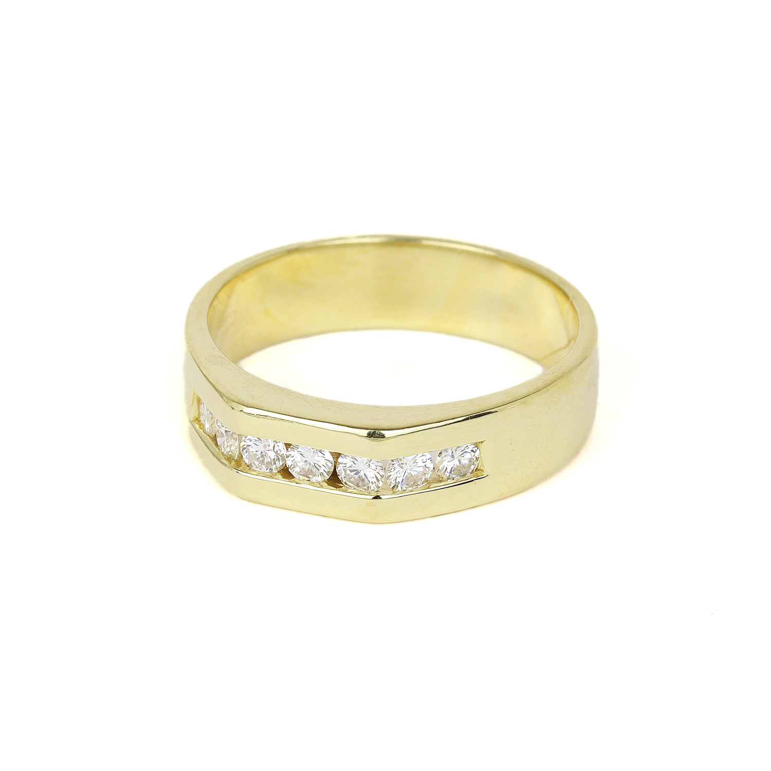 18k yellow gold ring with diamonds which amount to approximately 0.50 carat TW (VS1-VS2 clarity/J-K color). Fits a size 9.25 finger, measures 6mm wide, and weighs 8.0 grams.