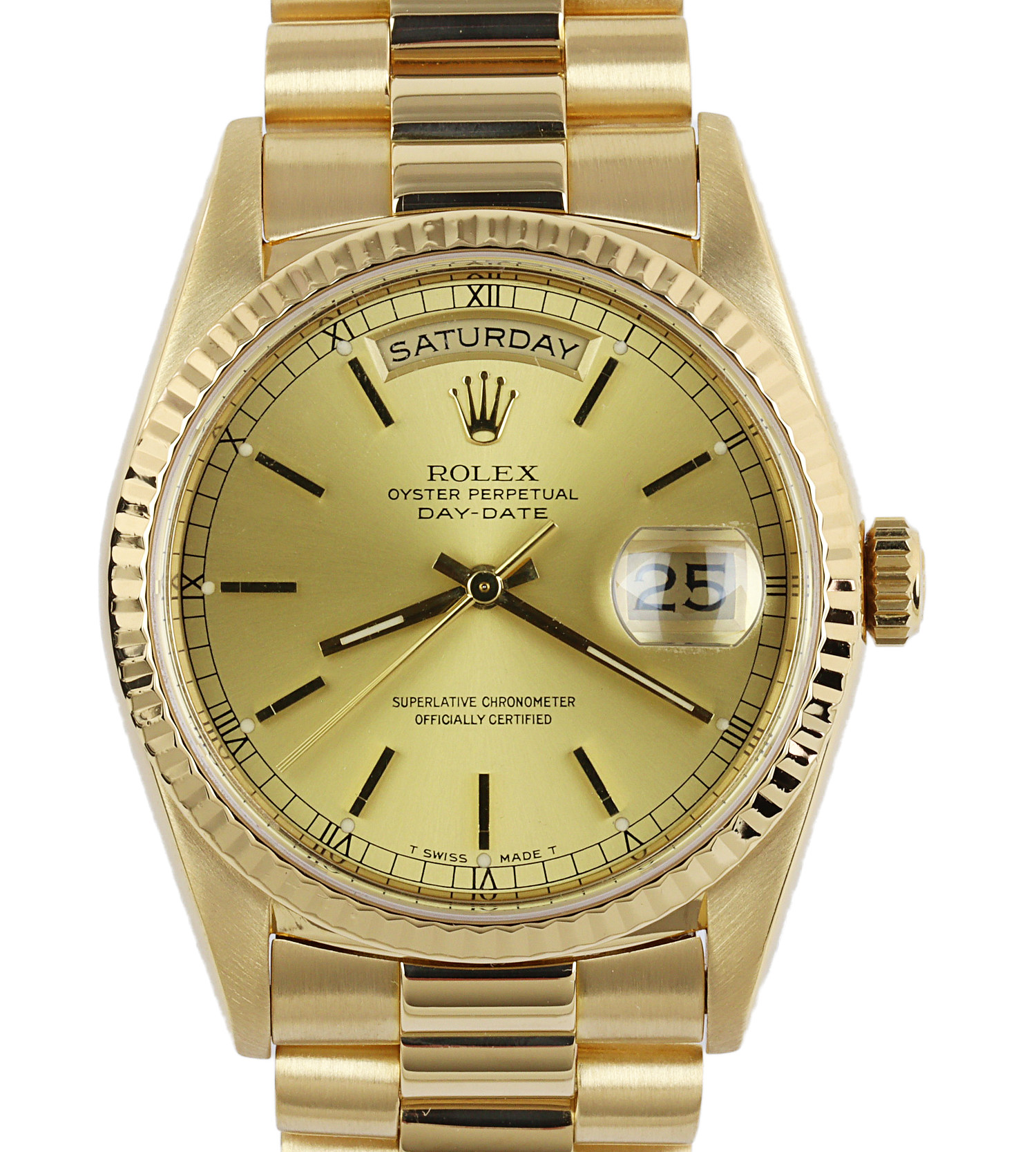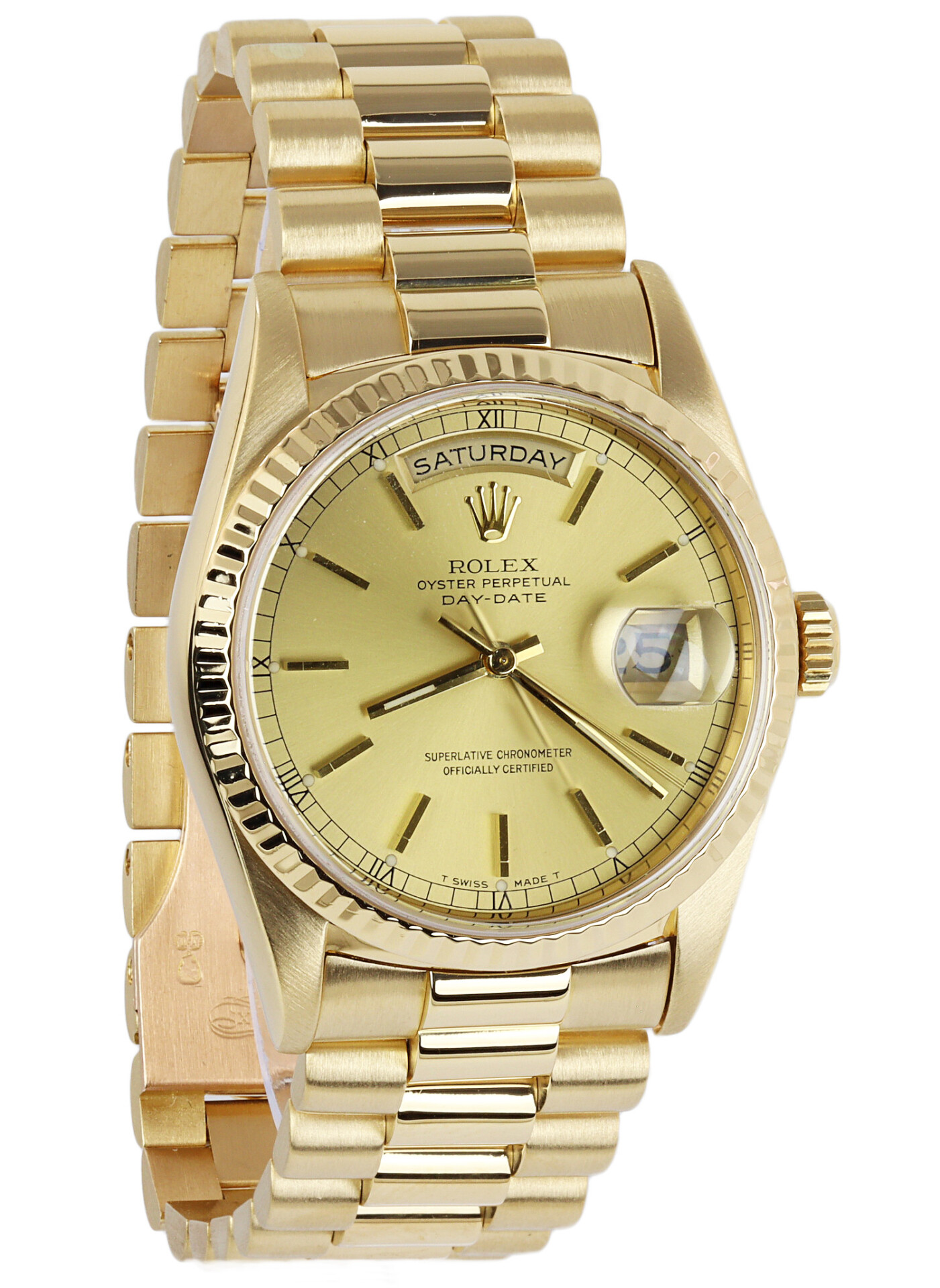 Rolex men’s 18k gold President 18238 wristwatch. Made circa 1989. No documents are included.