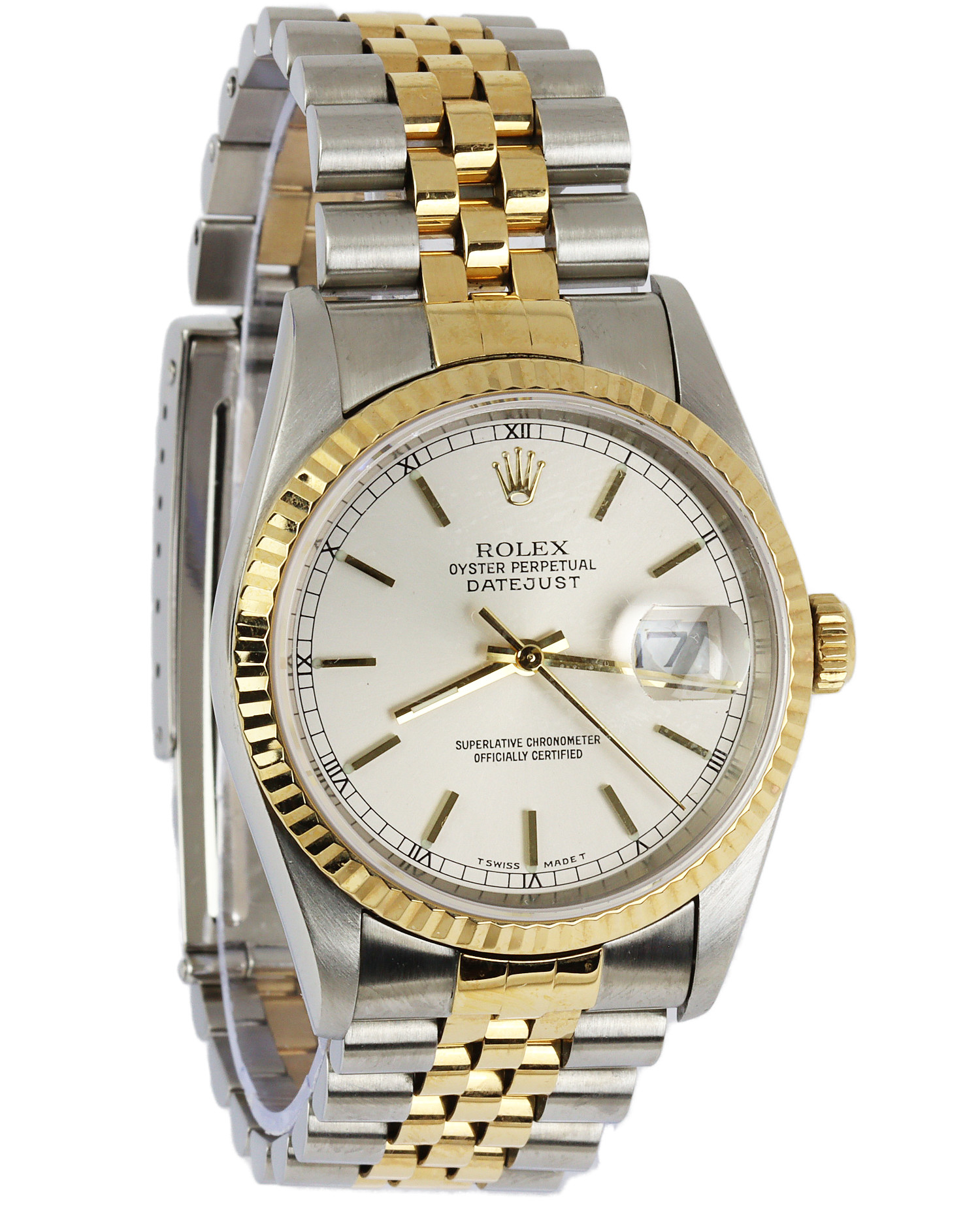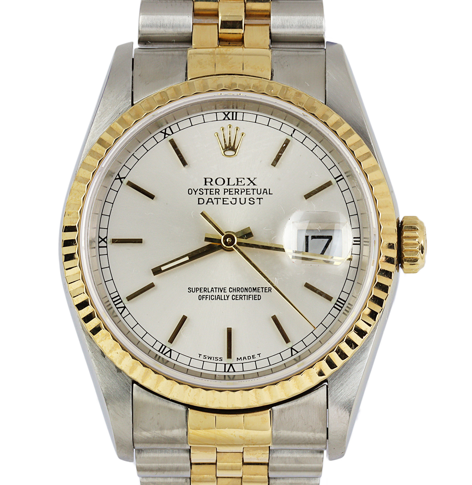 Rolex men’s 18k gold and stainless steel Datejust 16233 wristwatch. Made circa 1997. No documents are included.