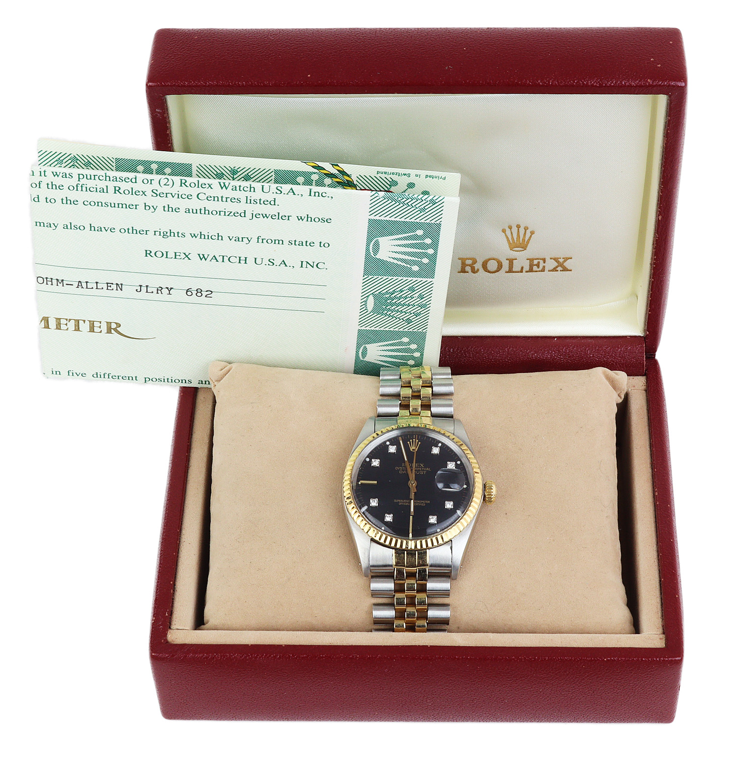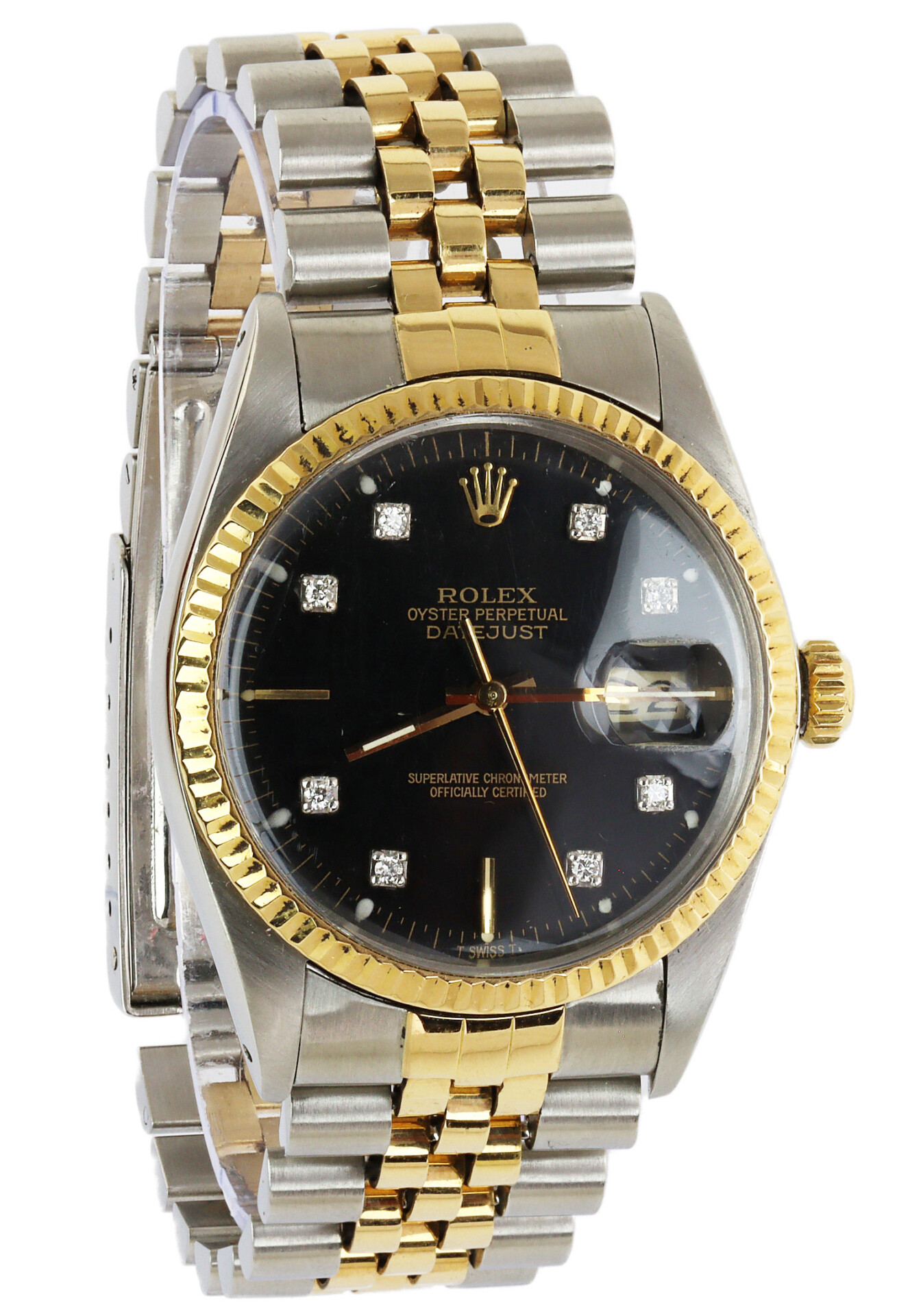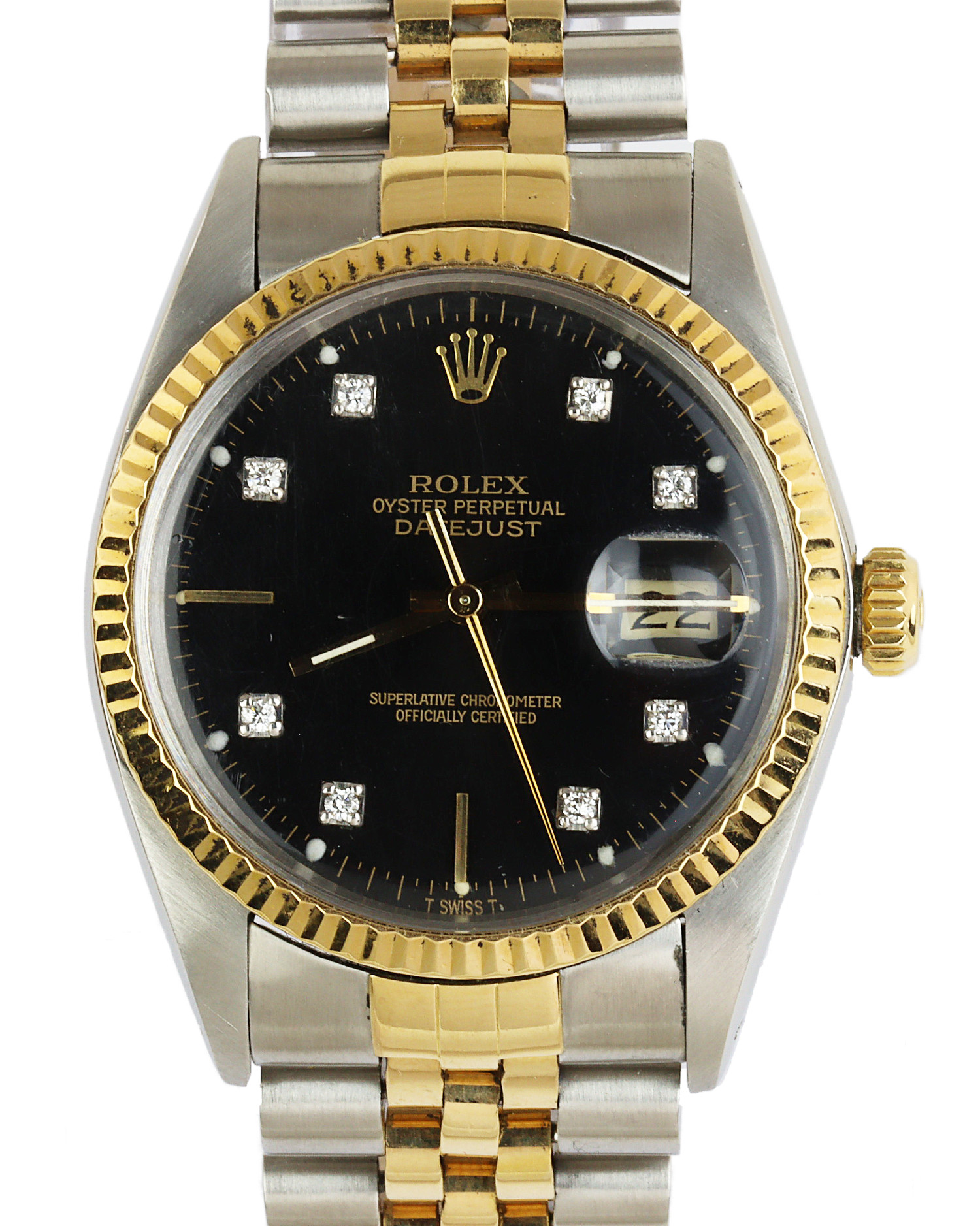 Rolex men’s 18k yellow gold and stainless steel Datejust 16013 wristwatch. Containing diamonds. Made circa 1985. Documents are included in the sale.