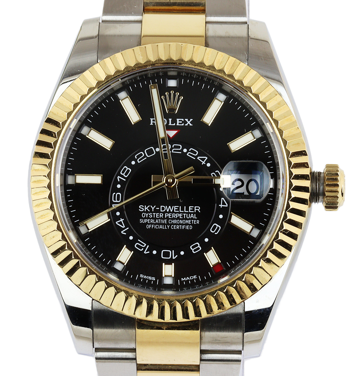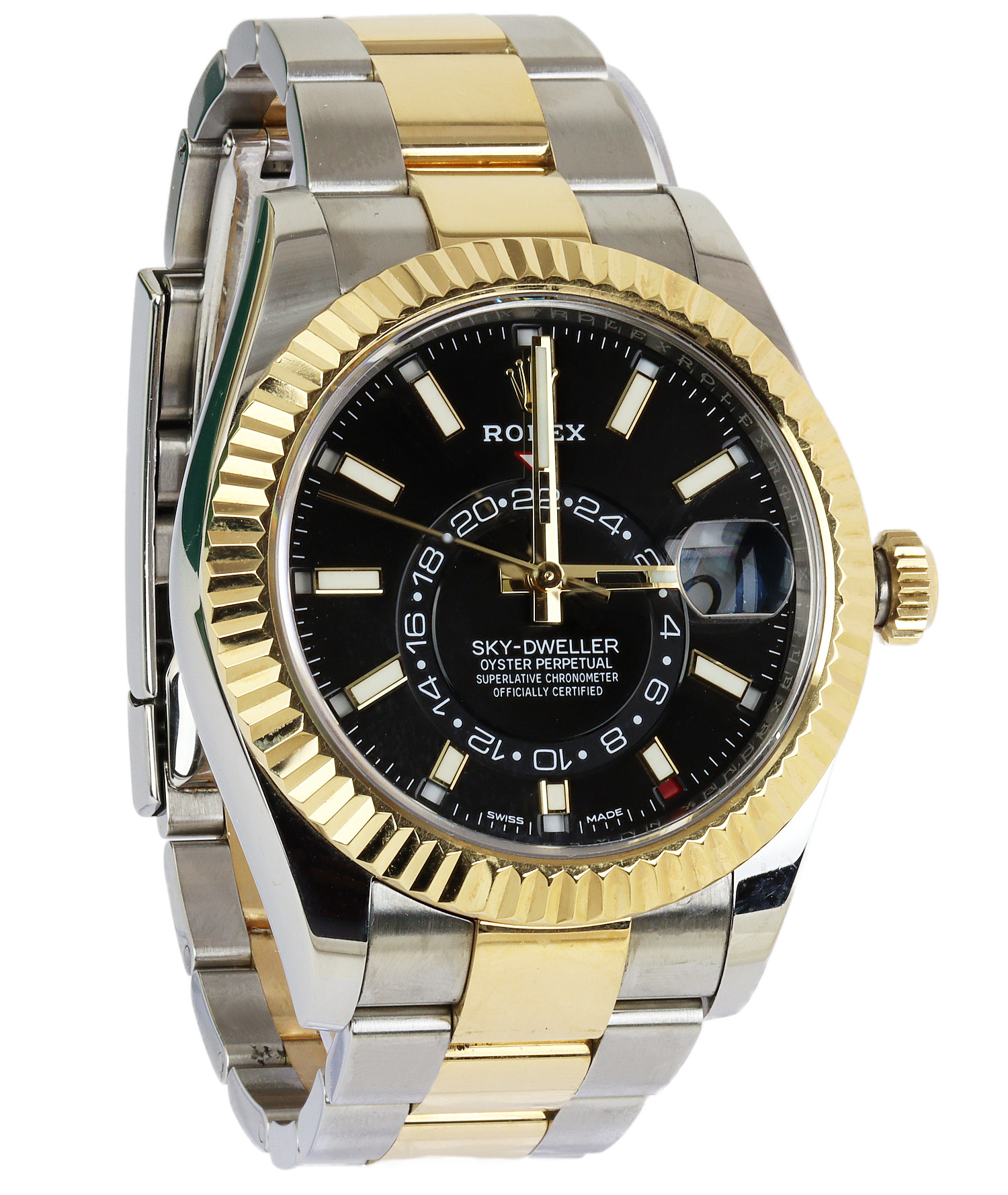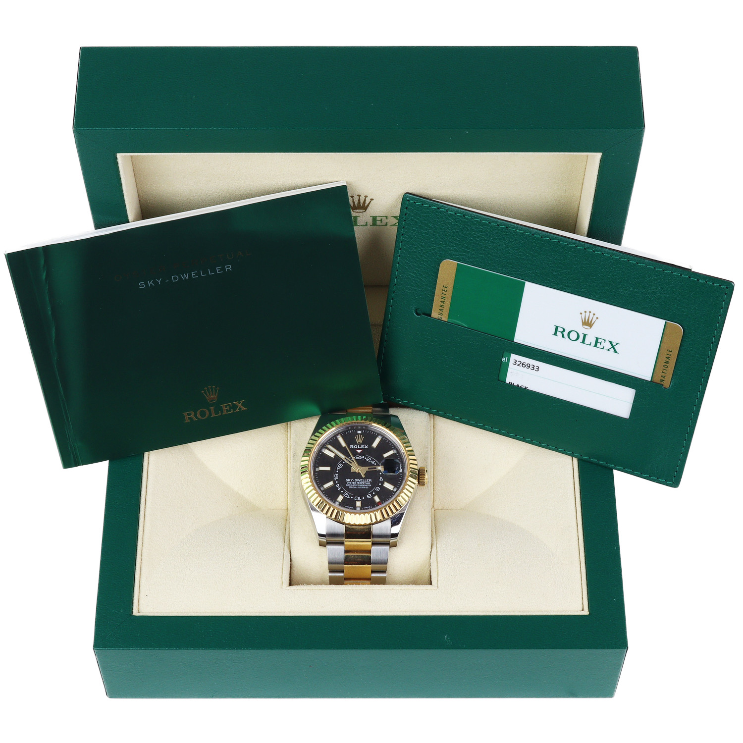 Rolex men’s 18k gold and stainless steel Skydweller 326933 wristwatch. Made circa 2008-2009. Documents are included in the sale.