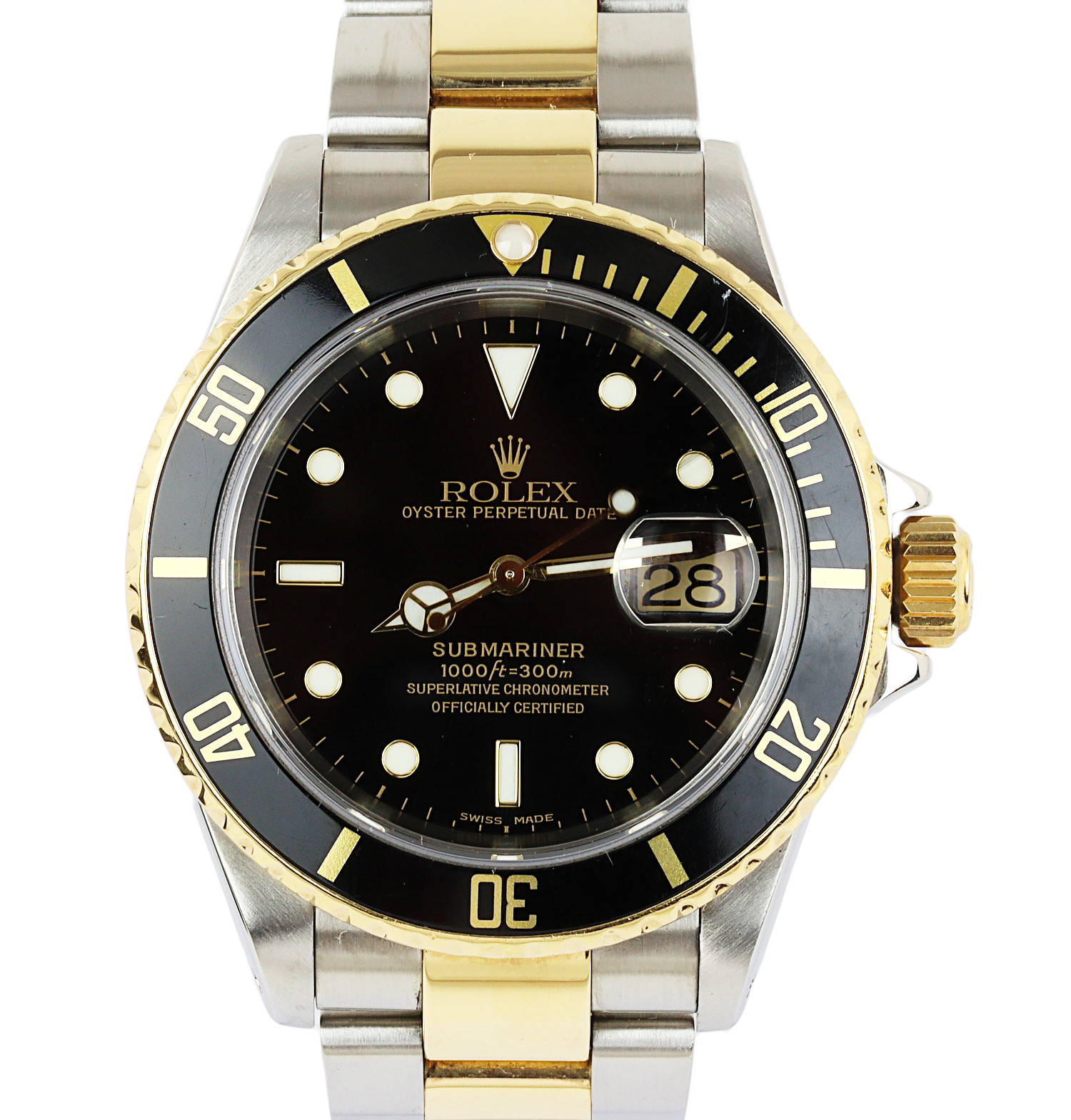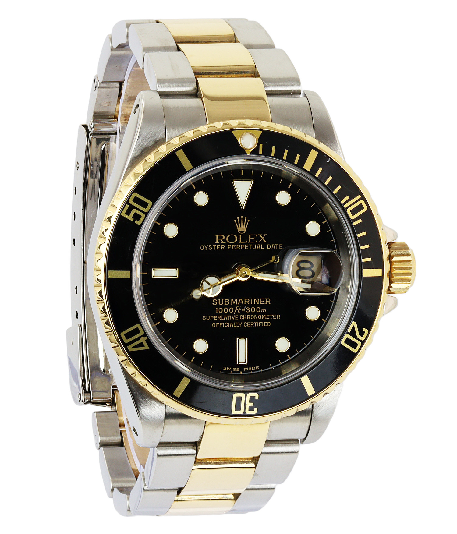 Rolex men’s 18k gold and stainless steel Submariner 16613 wristwatch. Made circa 2000. No documents are included.