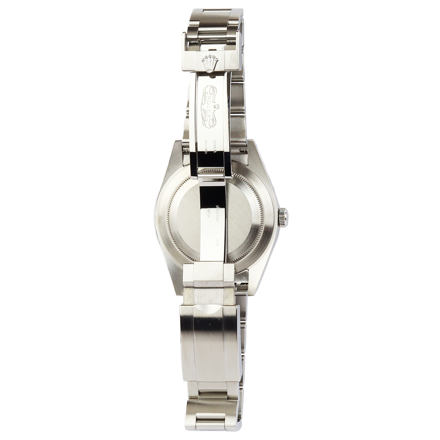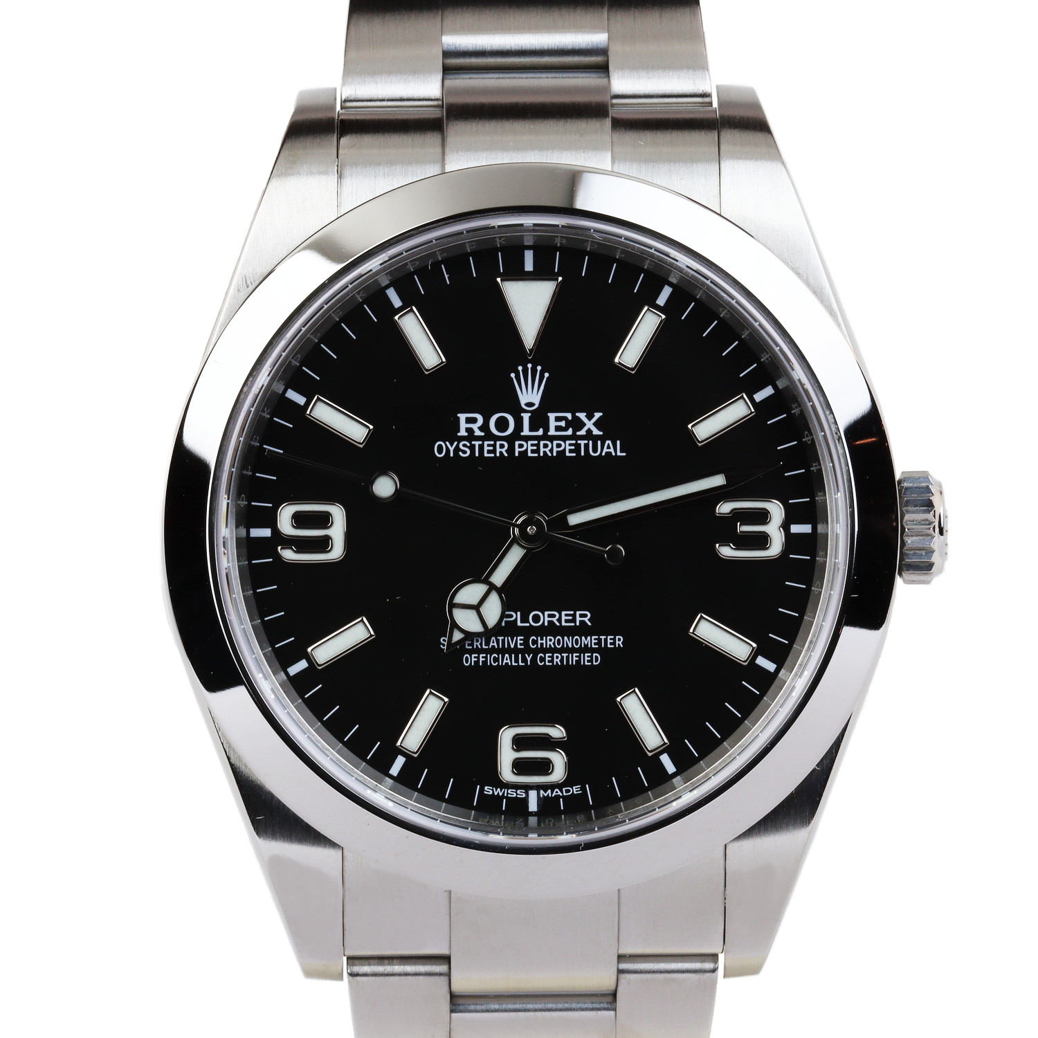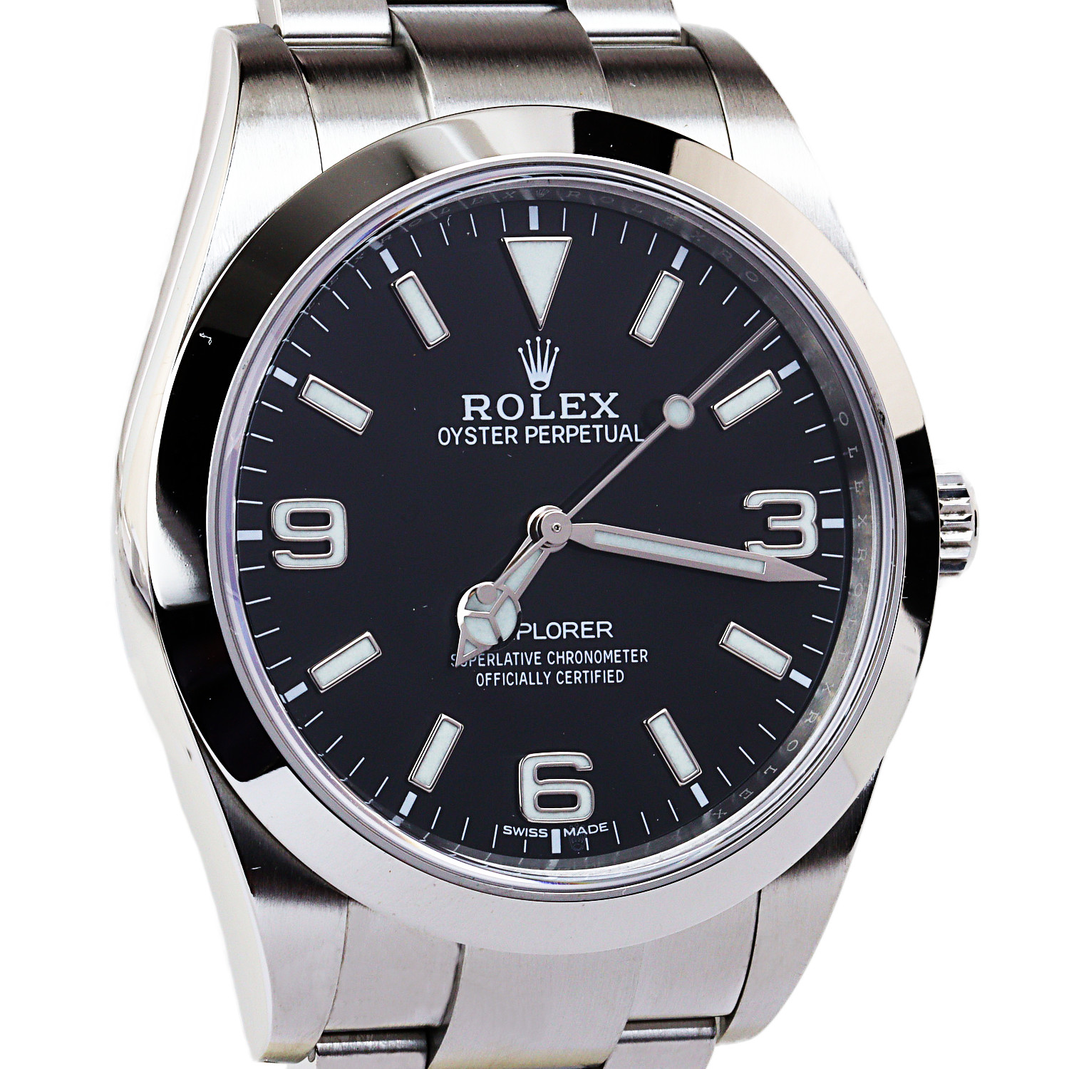 Men’s Rolex Explorer watch featuring a 39mm case and black dial. It weighs 135.5 grams and the band is currently set to fit a 7 1/4″ wrist.