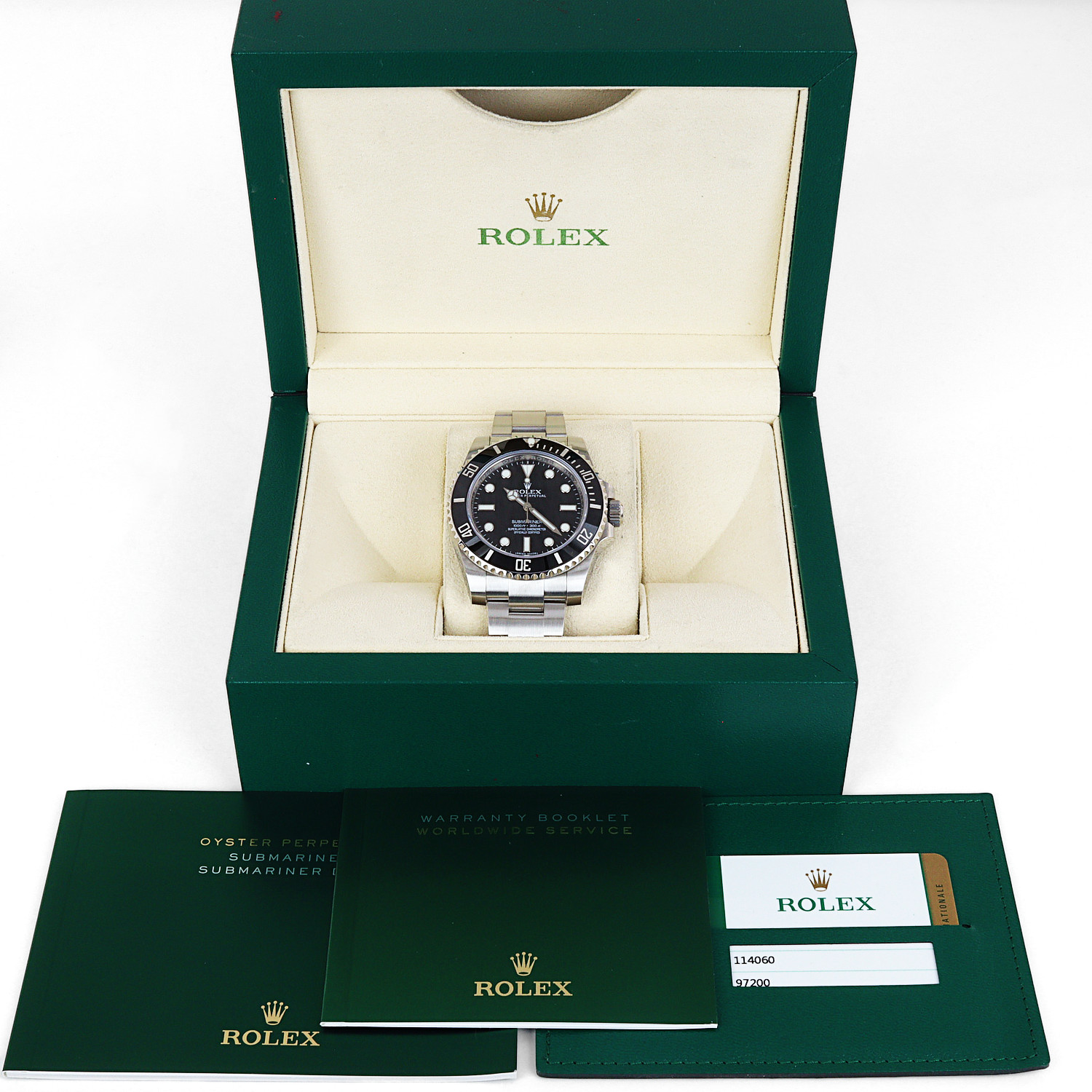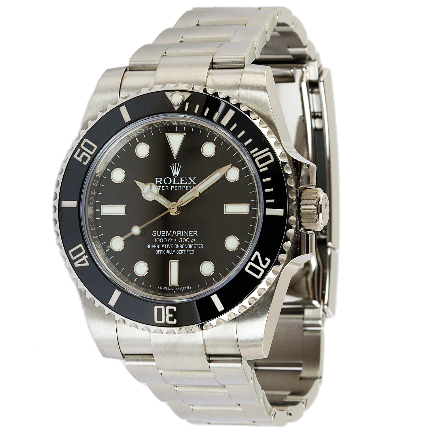 Men’s Rolex Submariner 114060 watch featuring a 40mm case, black dial, and no date indicator. It weighs 158.7 grams and the band is currently set to fit an 8″ wrist.