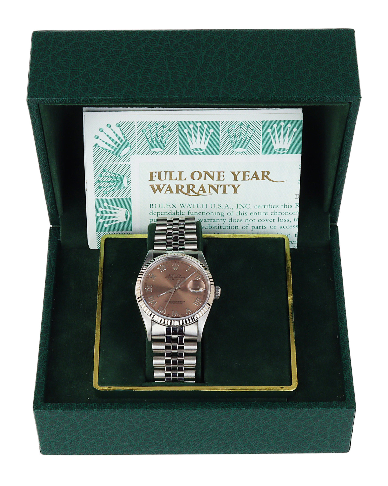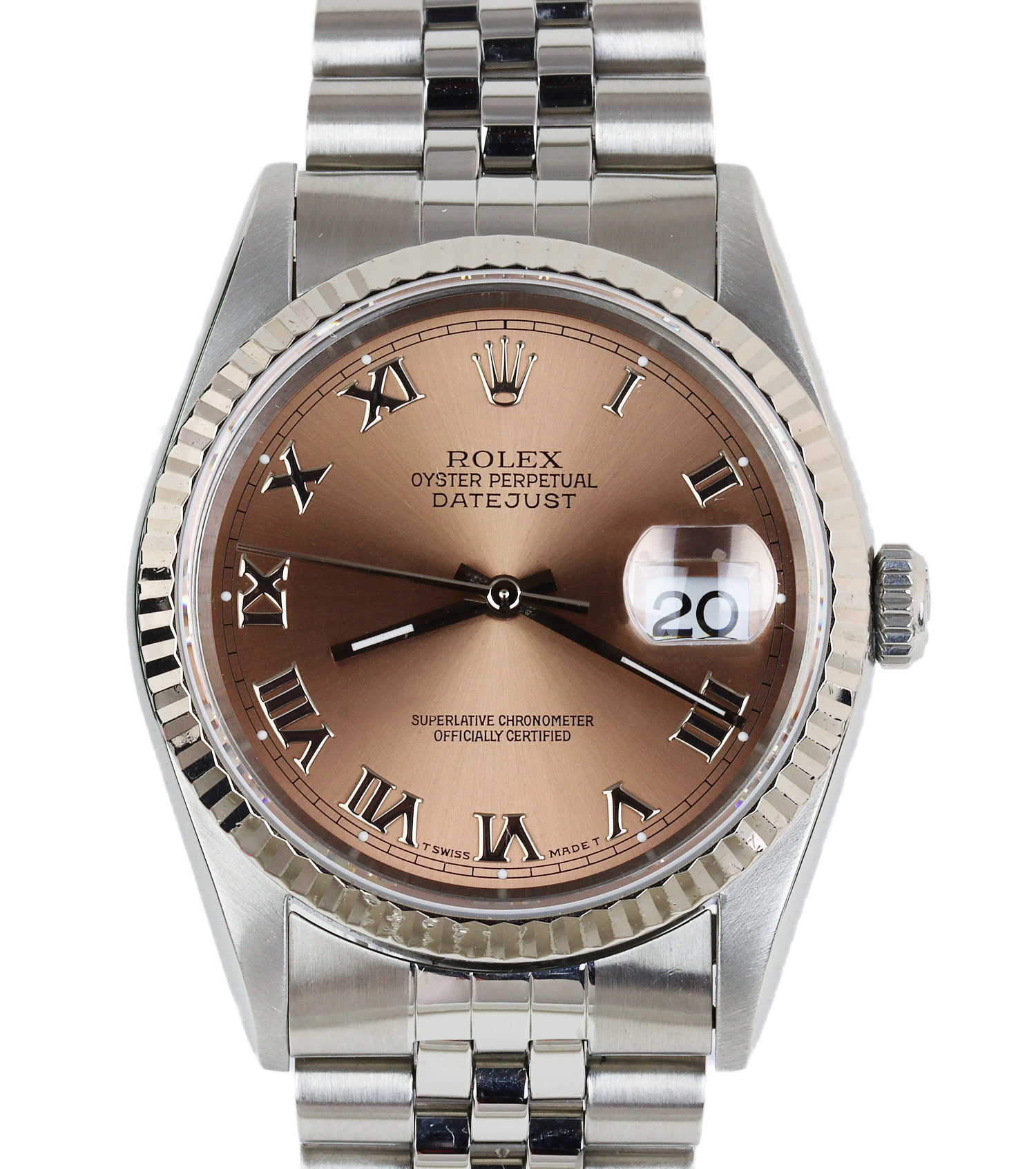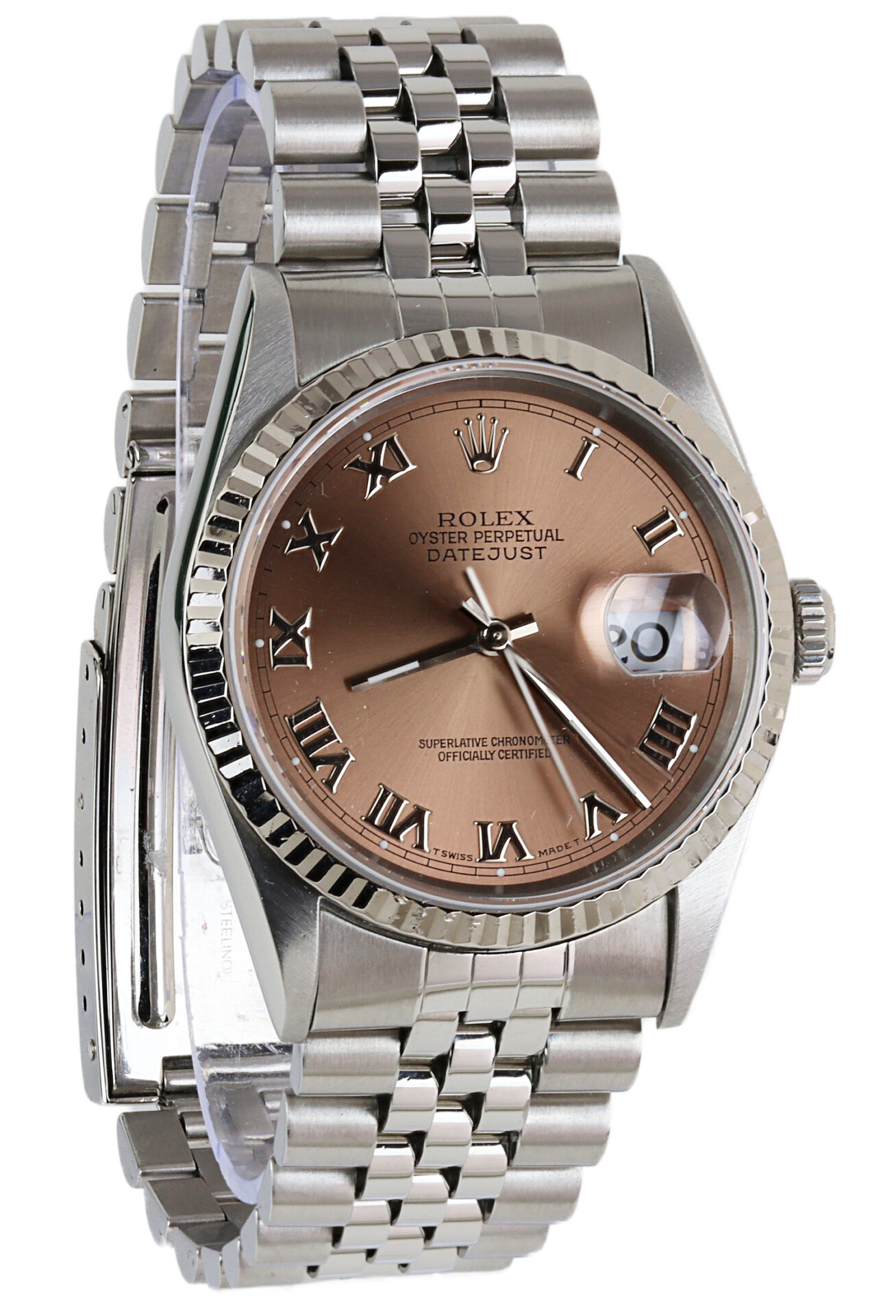 Rolex men’s stainless steel Datejust 16234 wristwatch. Featuring a Roman rose dial. Made circa 1998. Documents are included in the sale.