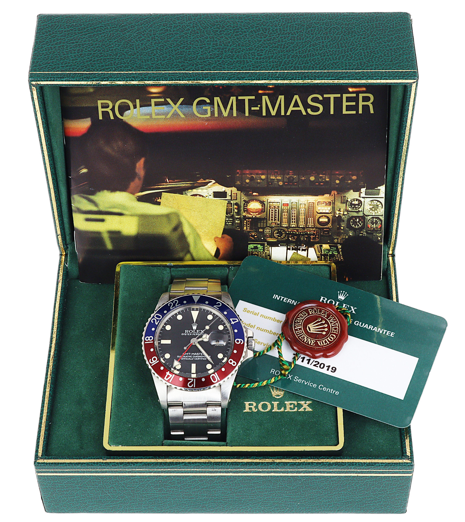 Rolex men’s stainless steel Pepsi GMT Master 16750 wristwatch. Made circa 1979. Documents are included in the sale.