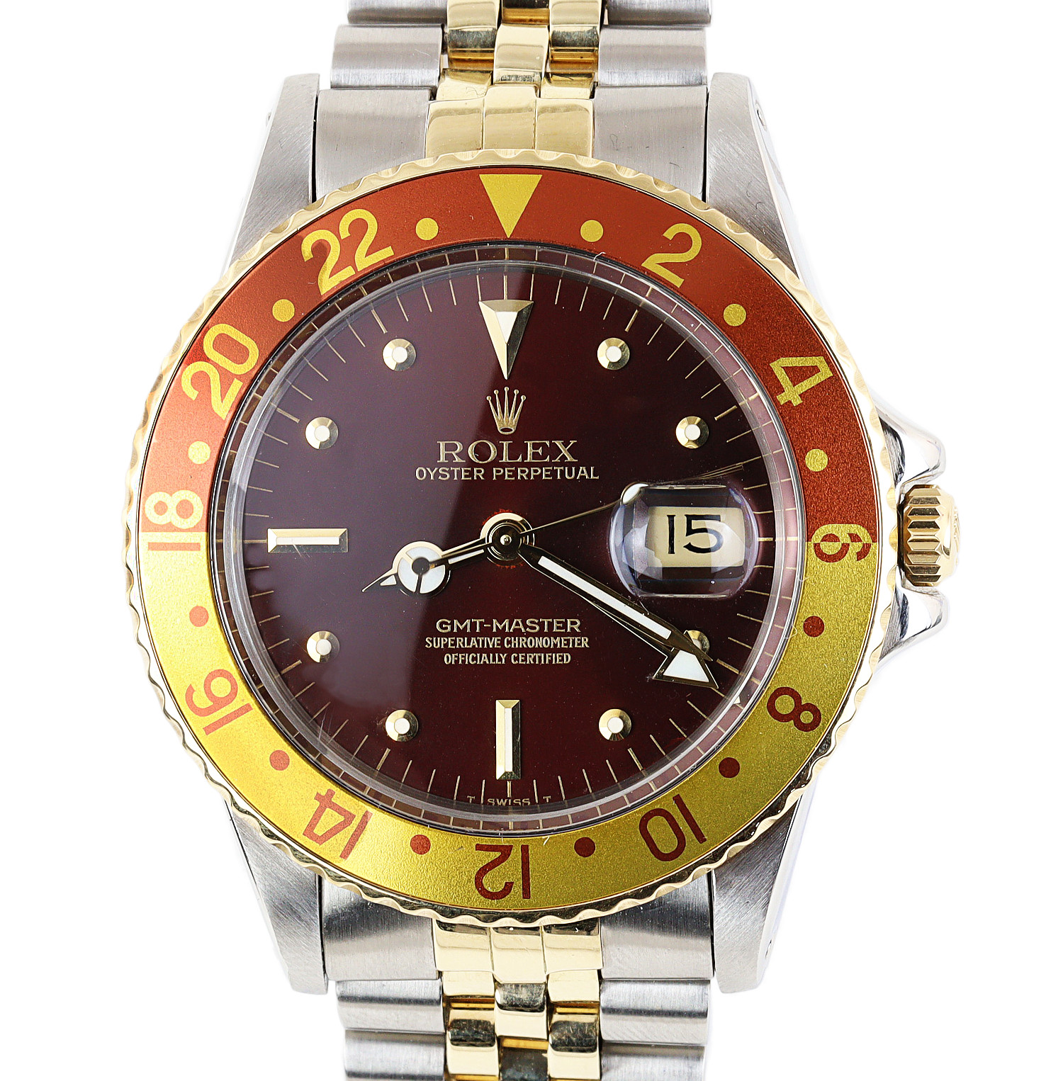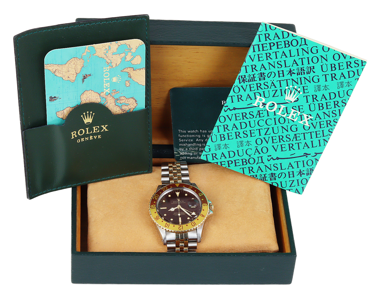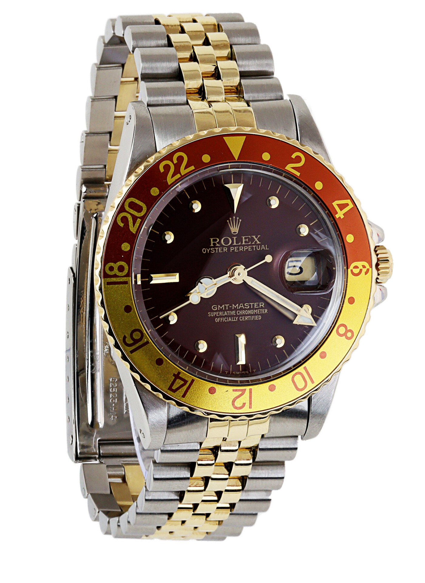 Rolex men’s stainless steel GMT Master Rootbeer 16753 wristwatch. Made circa 1979. Documents are included in the sale.